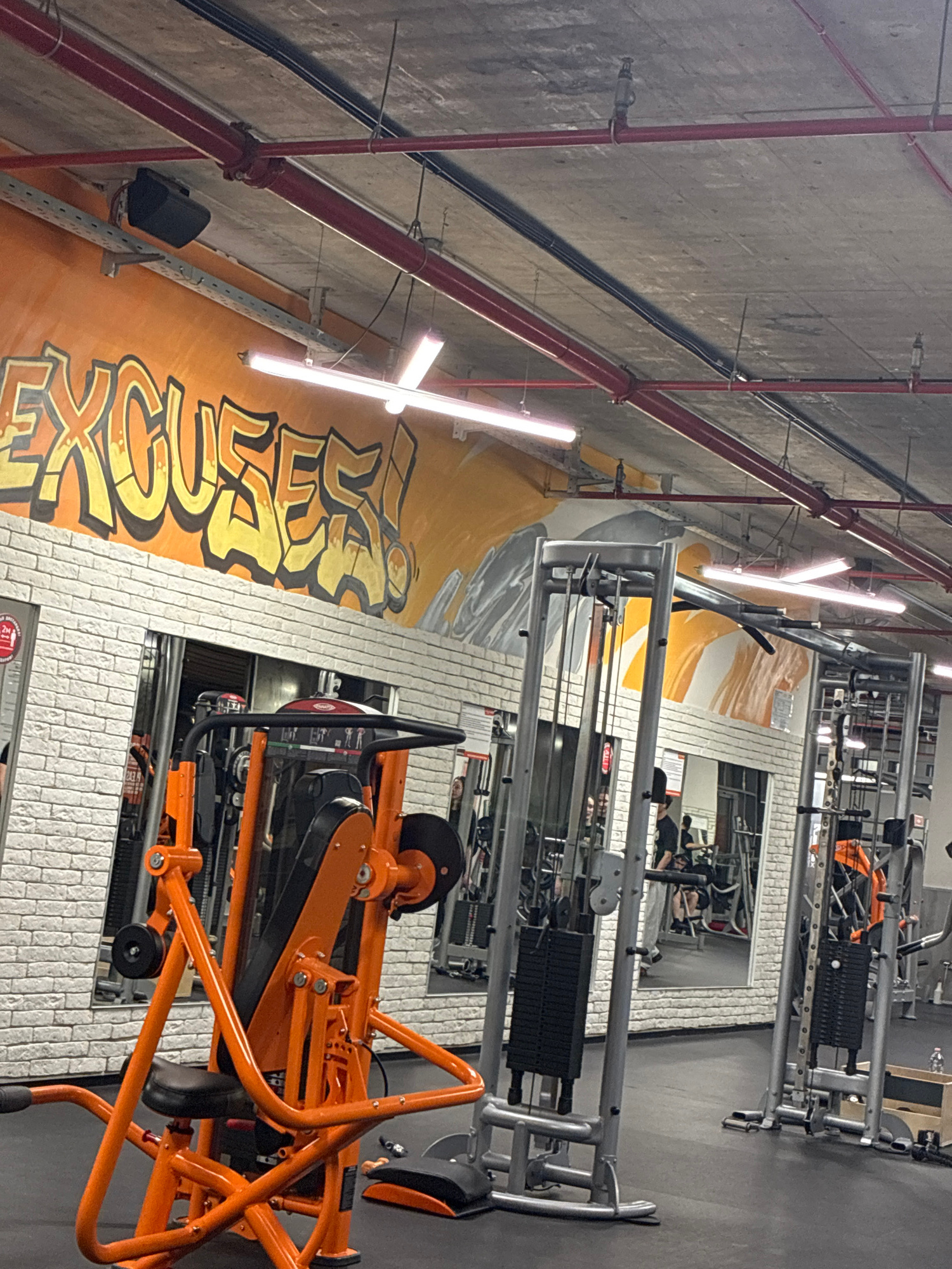 A gym in Plovdiv, Bulgaria, features fitness equipment arranged in rows along a wall adorned with a mural of the word "EXCUSE," painted in orange and yellow. Red pipes run horizontally along the concr…read more