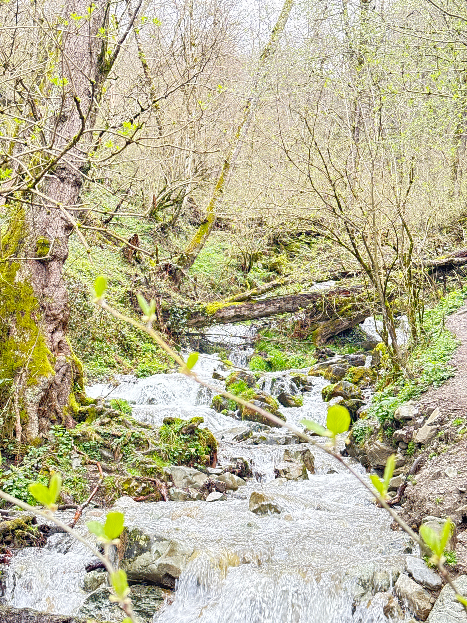 The image depicts a stream cascading down a rocky, moss-covered embankment in a forest setting. The water is moving rapidly, creating a textured, white surface. The surrounding vegetation is lush, wit…read more