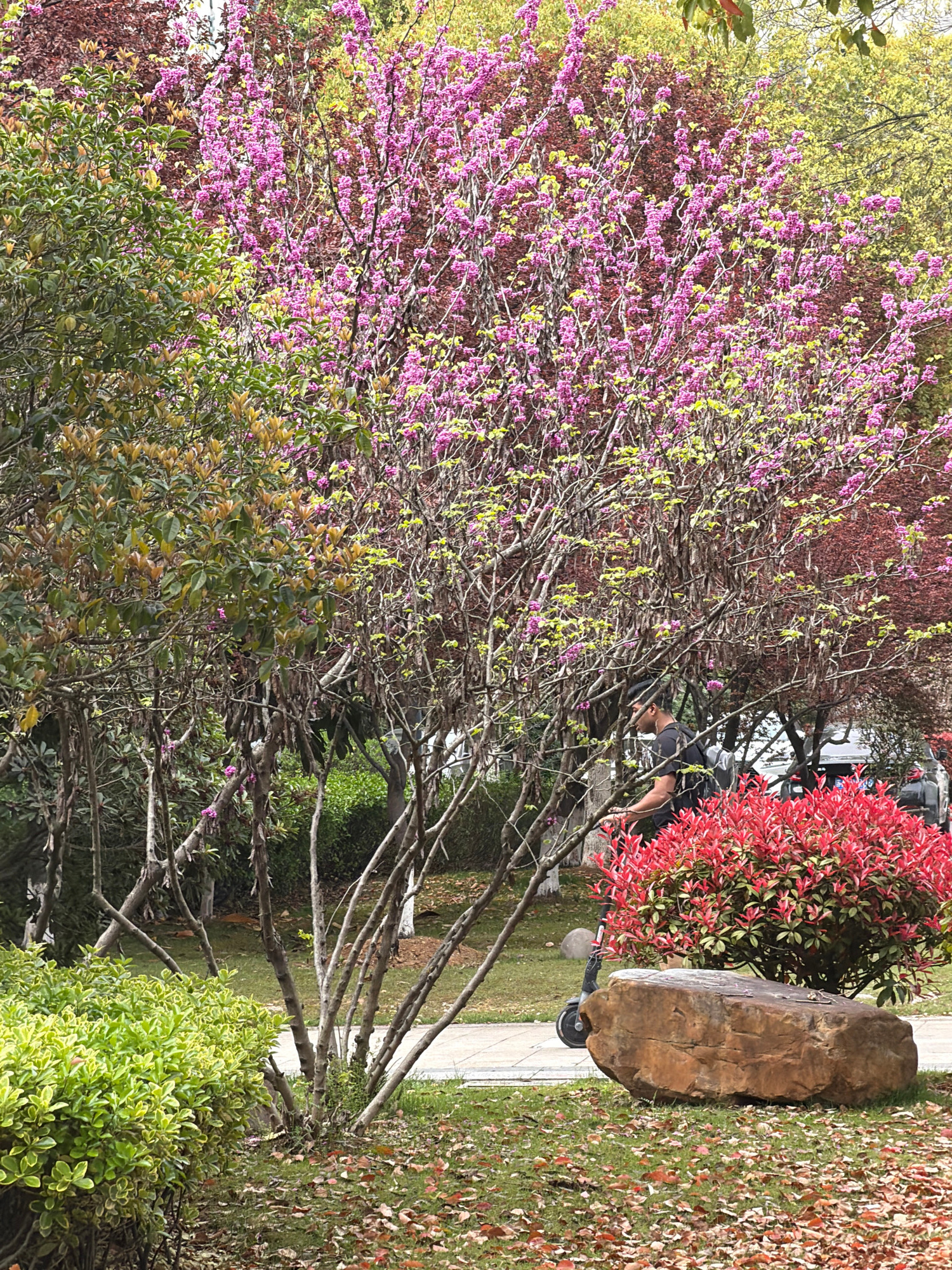 The image shows a scene in Jiangning District, China. Foreground: a flowering tree with purple blossoms and new green leaves dominates the view. Behind it are other trees with different foliage colors…read more