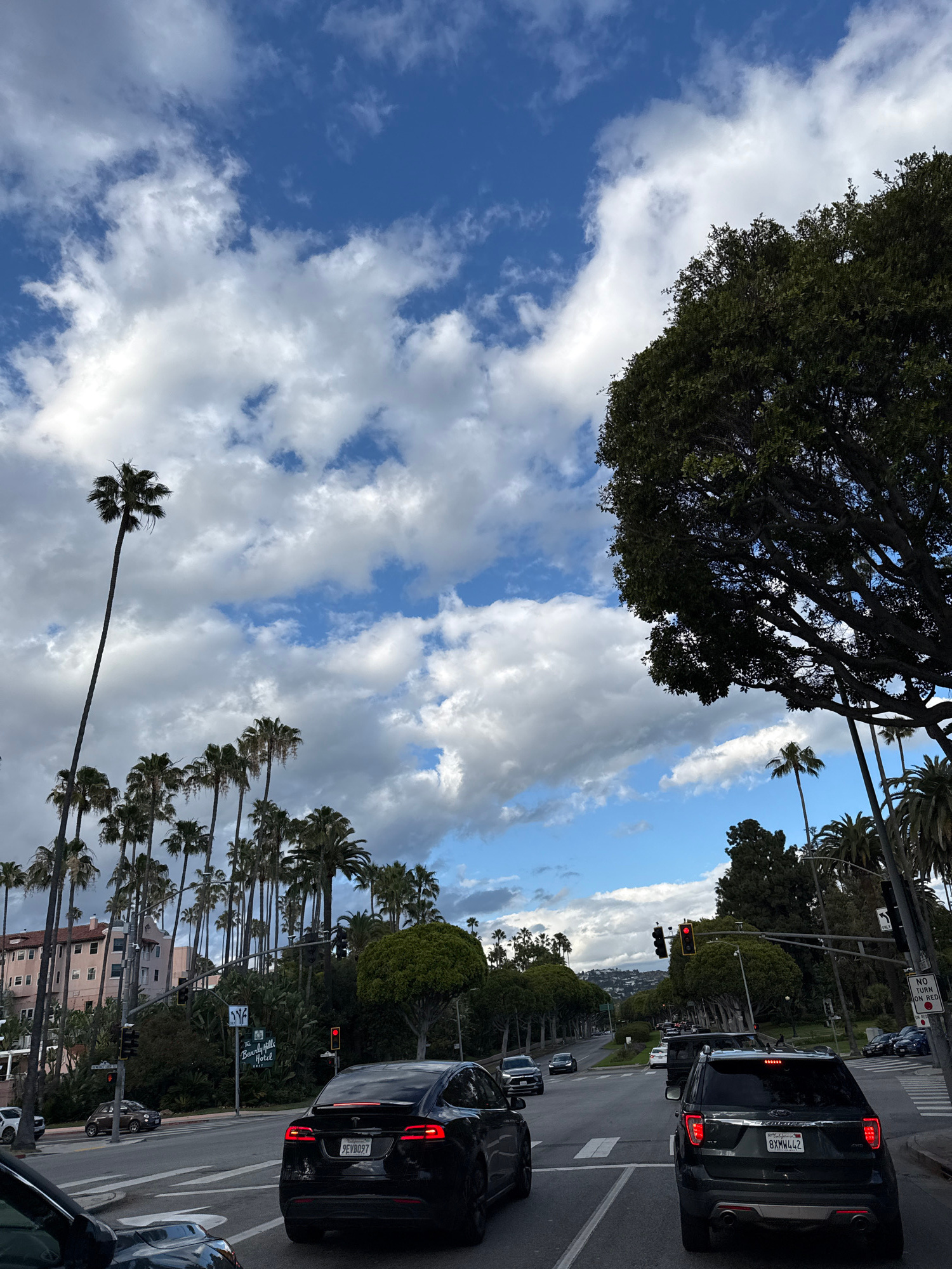 The image depicts a street scene in Beverly Hills, California, USA. Palm trees line the street, and cars are stopped at a red traffic light. The sky is visible with scattered clouds. A building is obs…read more