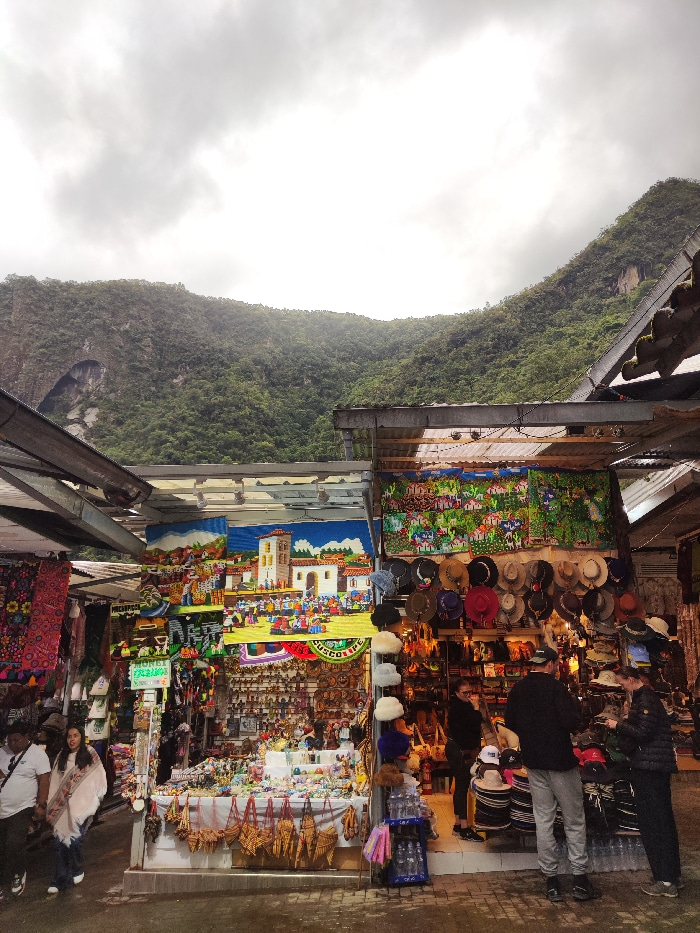 A vibrant marketplace is set against a backdrop of lush, green mountains under a cloudy sky. Stalls are laden with colorful textiles, hats, and various souvenirs. People are browsing and shopping. The…read more