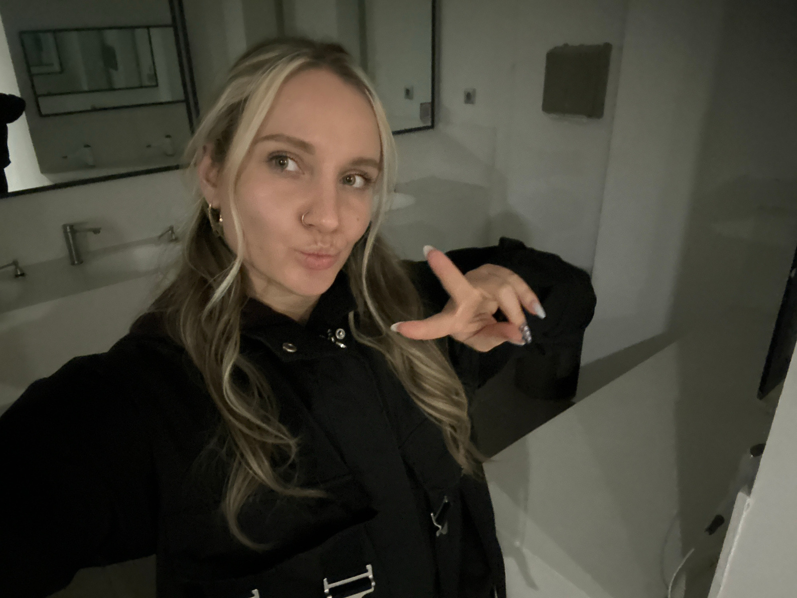 A woman with blonde hair and fair skin is holding up the peace sign and making a kissy face in an indoor location in Esenyurt, Turkey. She is wearing a black jacket. A hallway is visible in the backgr…read more