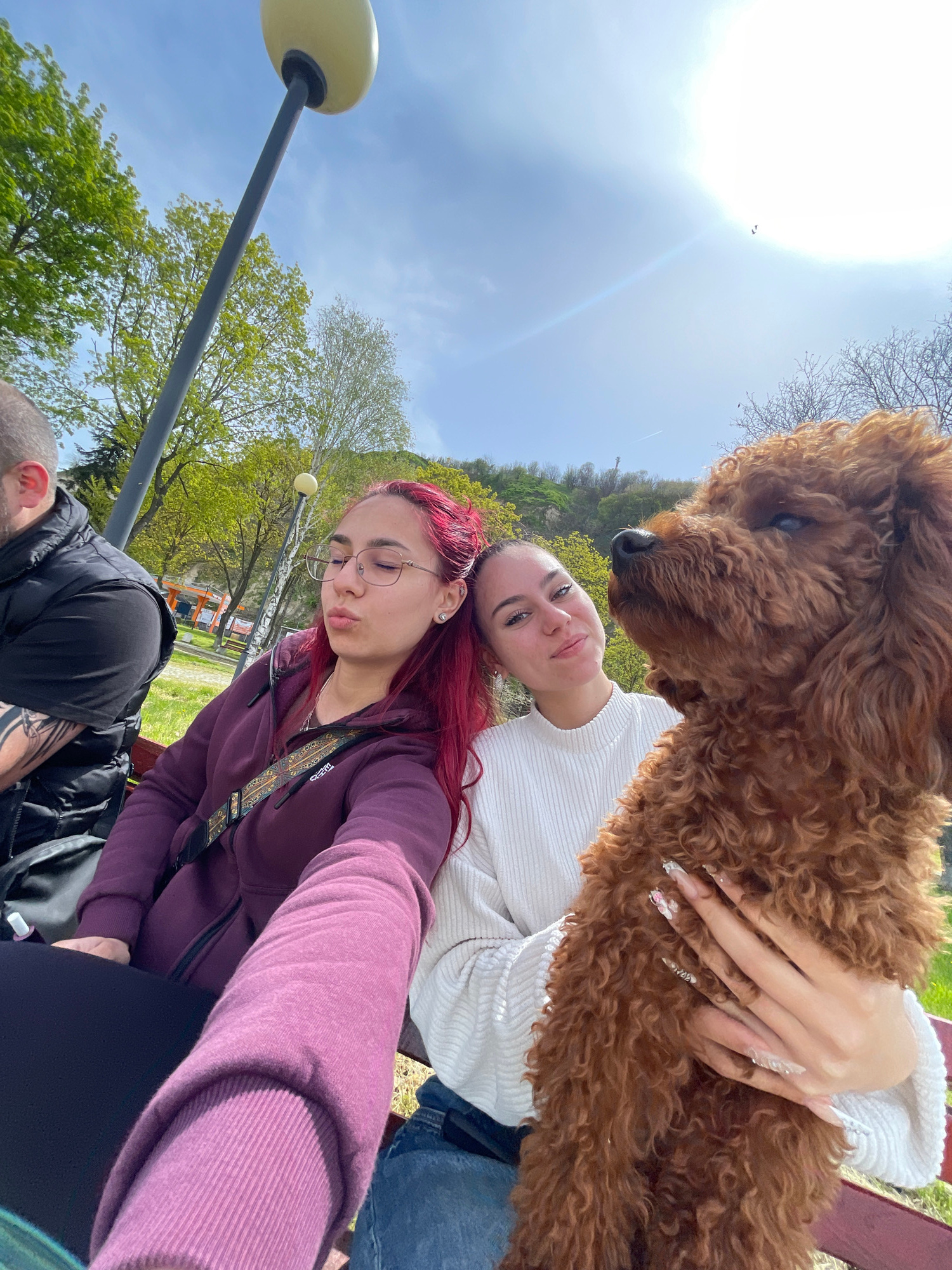 The image depicts two women and a brown poodle dog outdoors. One woman, with red hair and glasses, is wearing a purple sweatshirt. The other woman, with her hair pulled back, is wearing a white sweate…read more