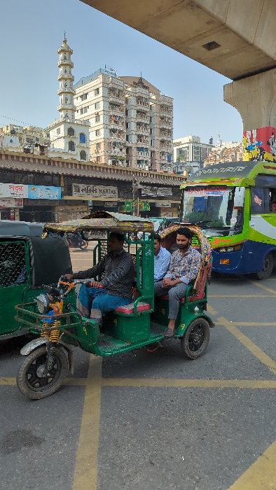 An auto rickshaw is parked on a street with yellow lane markings. Two passengers are seated in the back, while the driver sits in the front. Buildings and a tall tower are visible in the background. A…read more