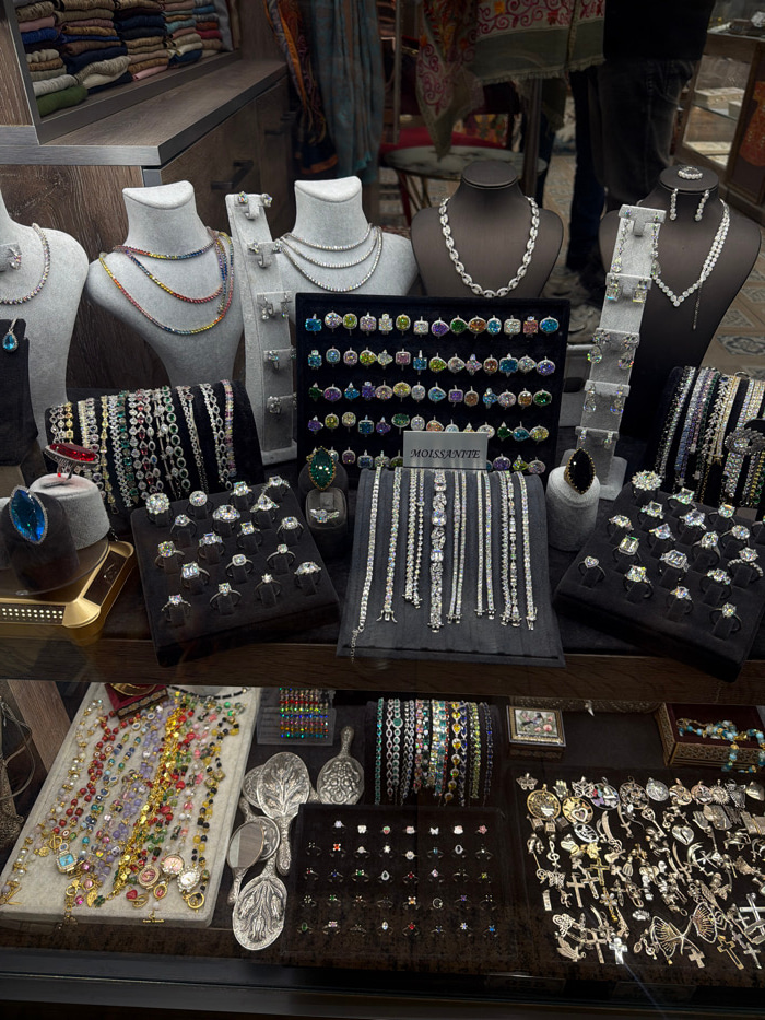 The image displays an extensive jewelry collection presented within a retail display case, characteristic of a shop or stall in a prominent market, likely the Grand Bazaar in Istanbul, Turkey. The up…read more