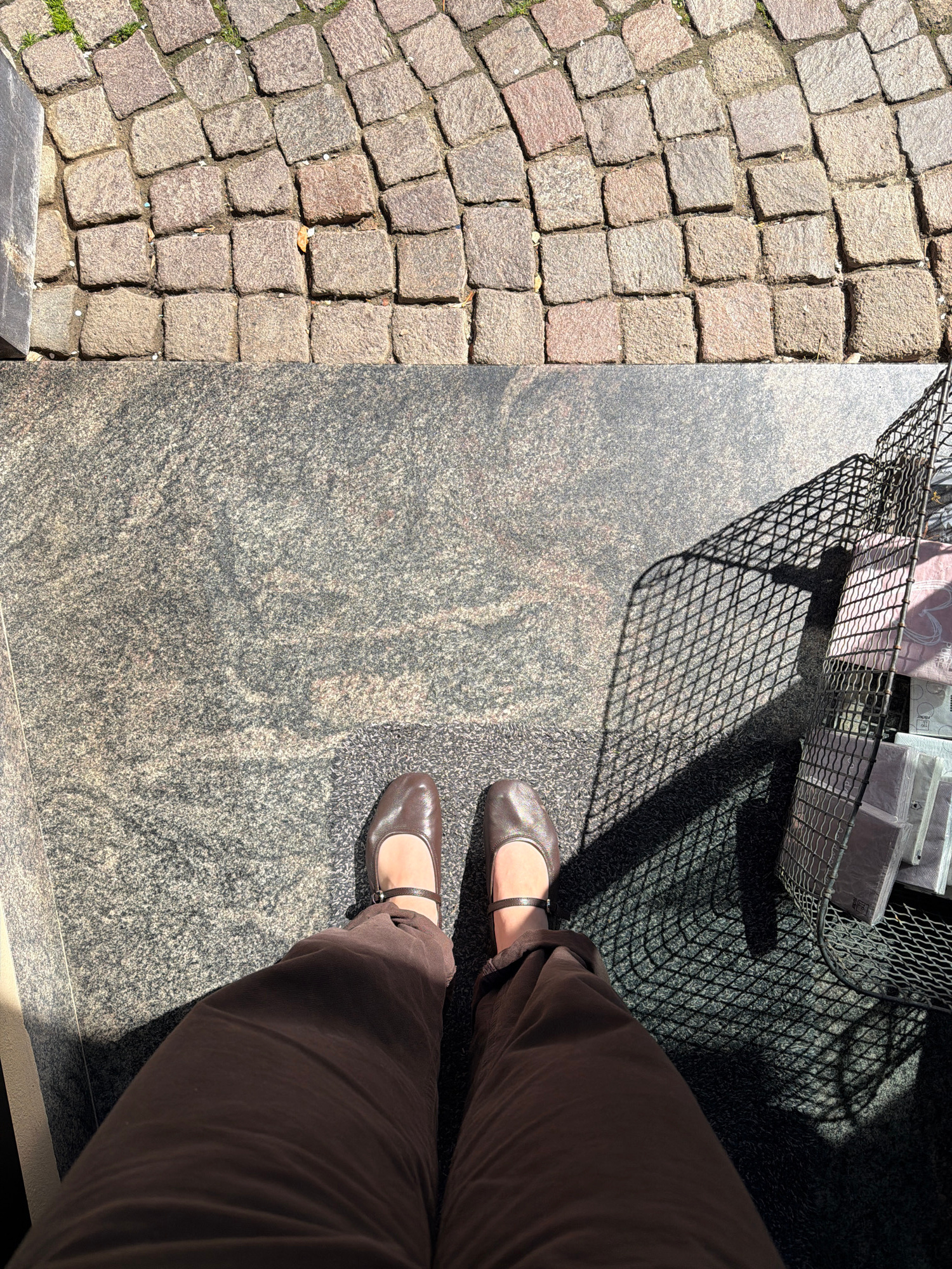 The image presents a high-angle, first-person view looking down at a person's feet and the ground in Meisenheim, Germany. The scene is sharply divided into two distinct surfaces. On the left, an expan…read more