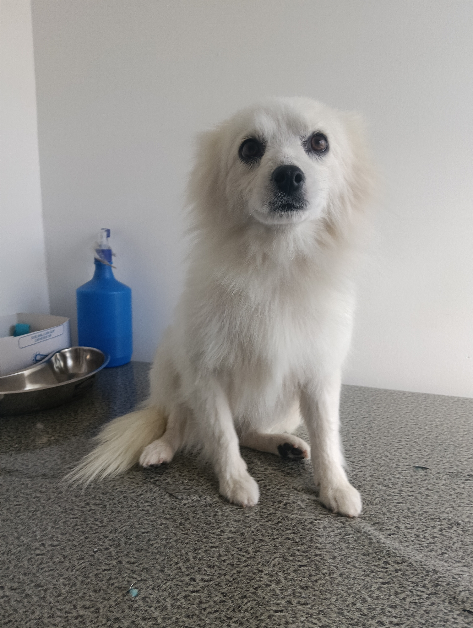 A white-coated canine subject, consistent with a Spitz-type dog, is centered and seated upright on a grey speckled examination surface. The animal's dark eyes are wide and directed forward, with a bla…read more
