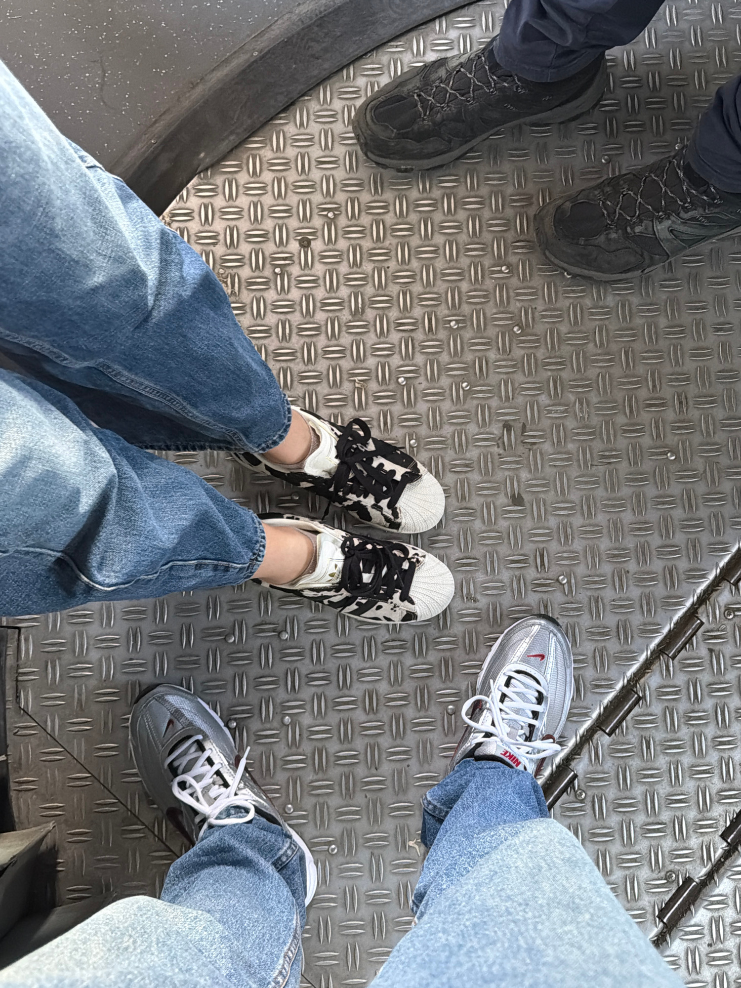 The image shows an overhead view of four pairs of legs and shoes standing on a metal platform. The legs are wearing jeans. The shoes are different styles: dark hiking boots, Adidas Superstar with a bl…read more