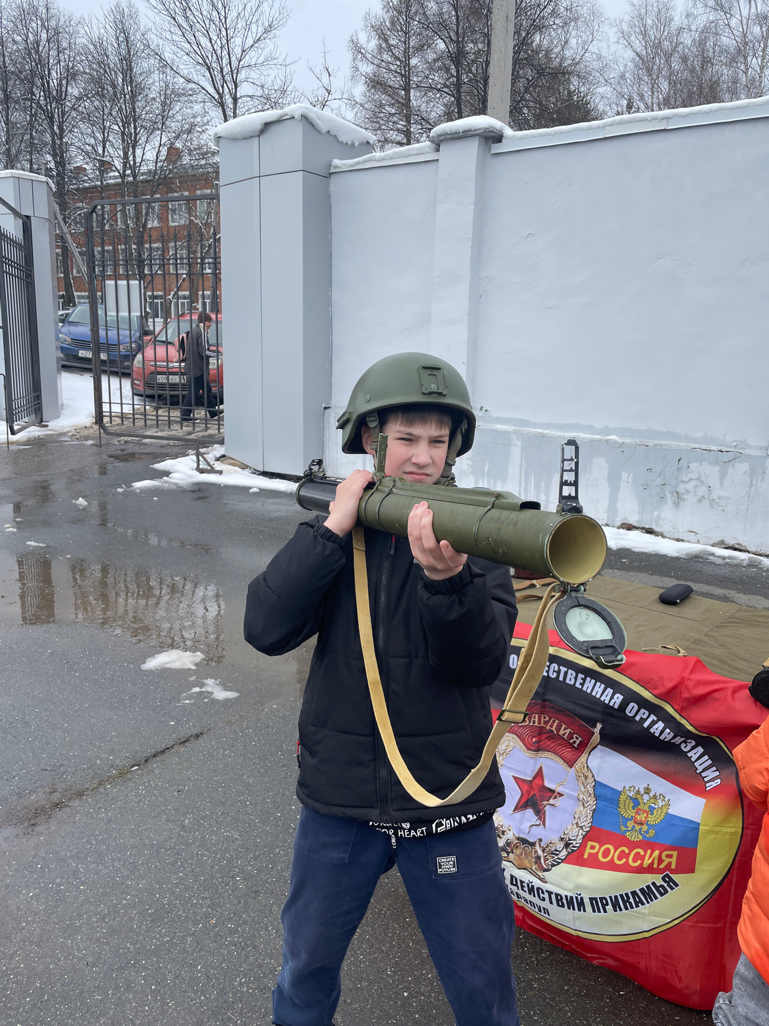 A young boy wearing a military helmet is holding a green-colored tube resembling a rocket launcher. The setting appears to be outdoors near a building, with a small patch of snow on the ground. In the…read more
