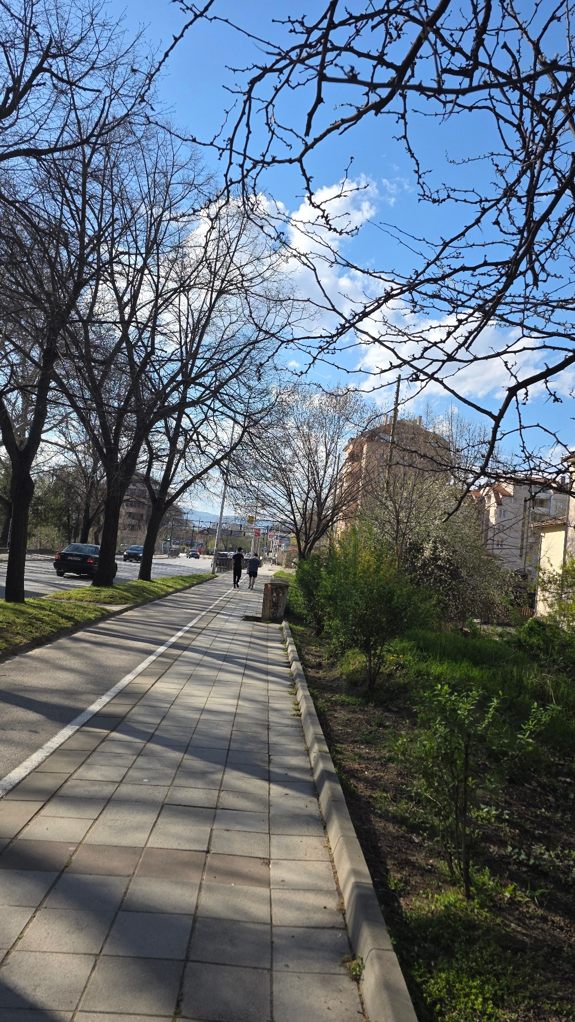 The image depicts a sidewalk in Blagoevgrad, Bulgaria, bordered by a street with cars and greenery on one side, and buildings and more greenery on the other. Two people are walking away in the middle…read more