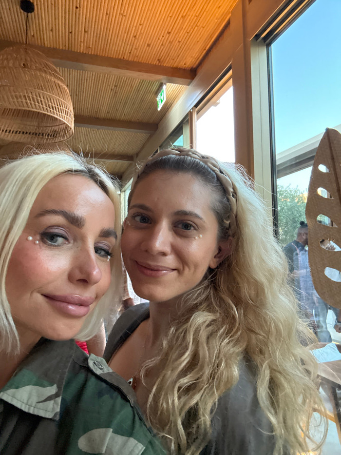 The image displays two adult females in a close-up, selfie-style photograph taken indoors at a venue in Dubai, United Arab Emirates. The female on the left has blonde hair, light-colored eyes, promine…read more