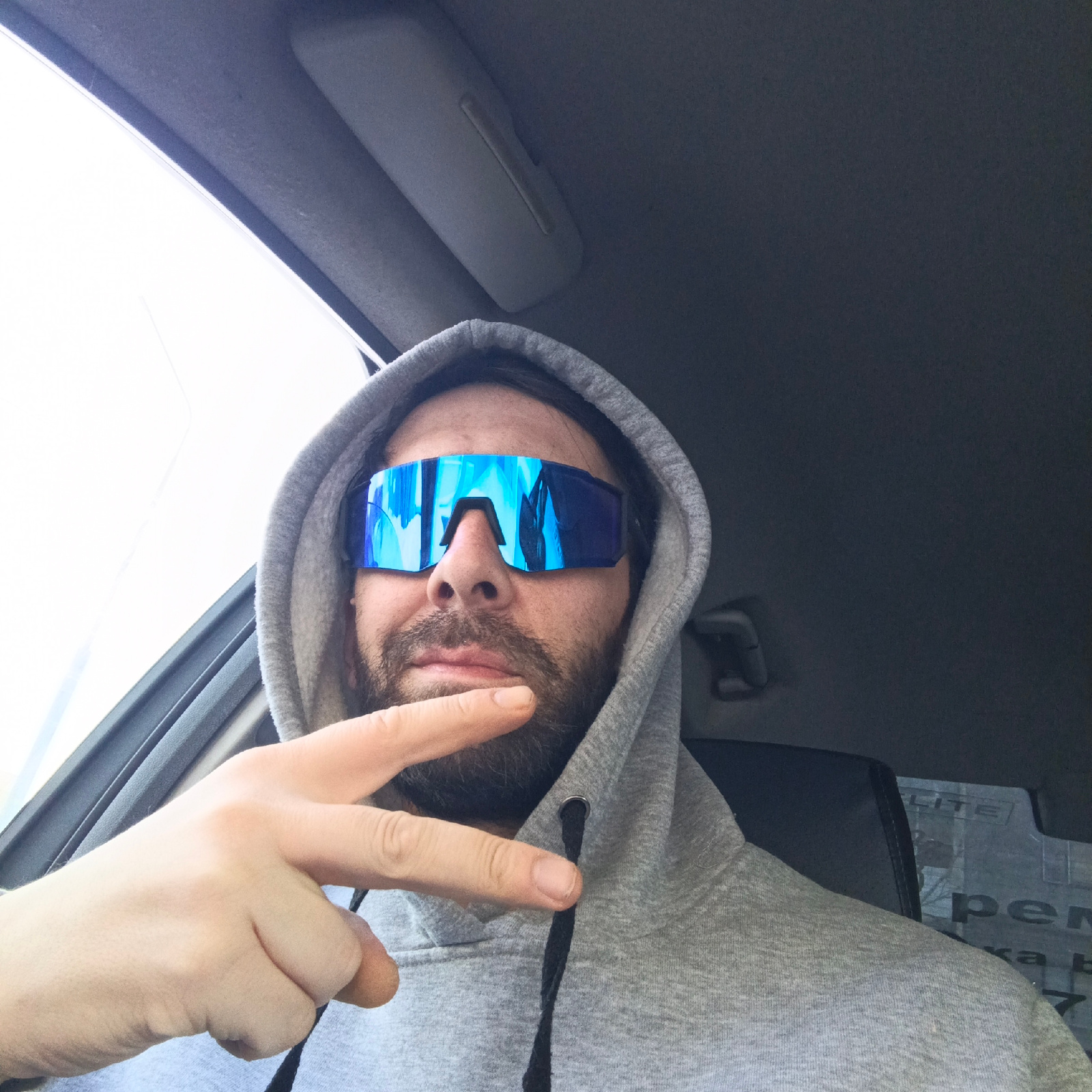 A male individual is depicted seated within a vehicle interior in the city of Марковский, Russia. The subject has a beard and dark hair, obscured partially by a grey hooded sweatshirt with the hood pu…read more