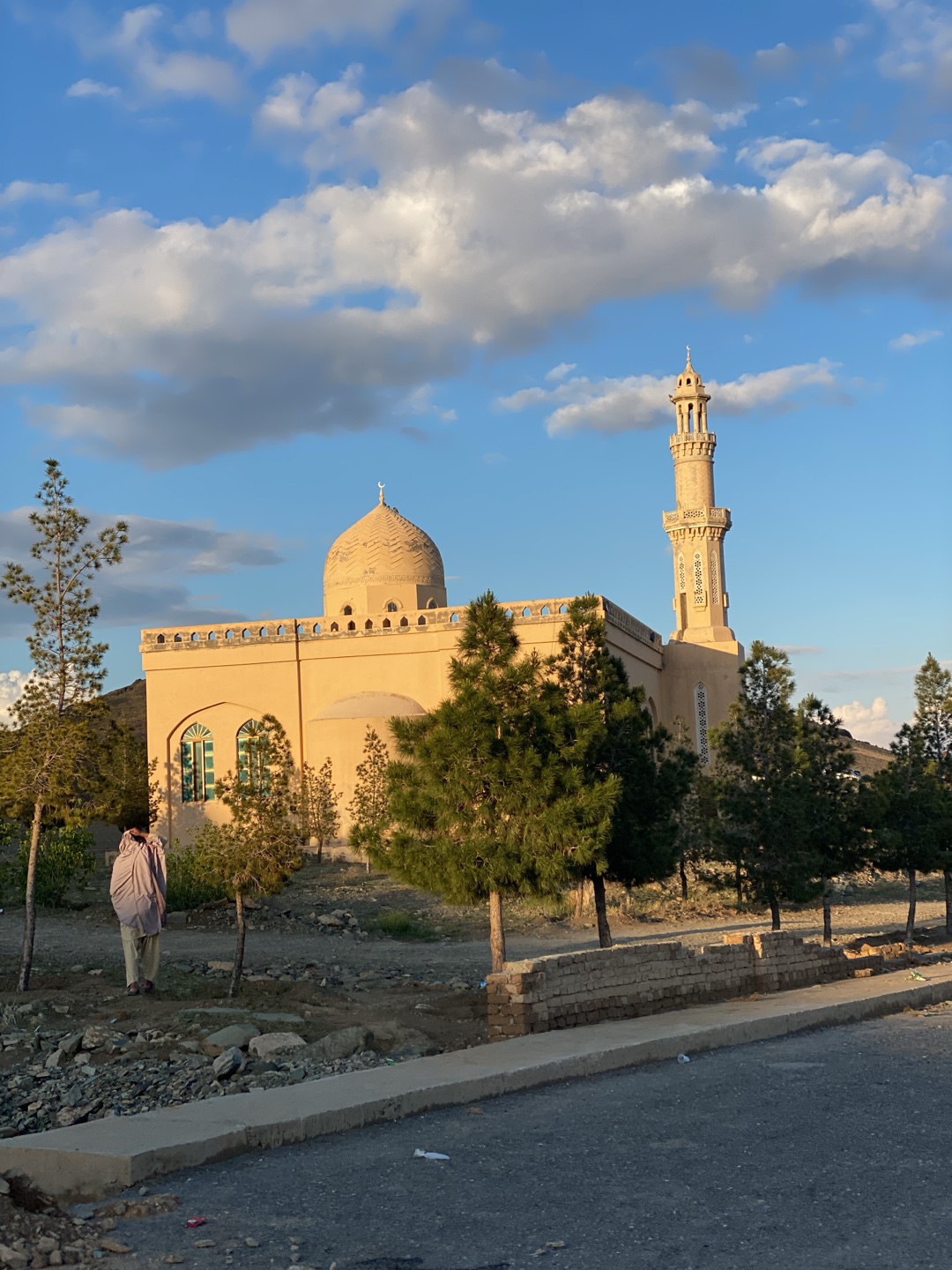 A medium shot captures a mosque under a blue sky with fluffy white clouds. The mosque, tan in color, has a dome and a minaret. A few trees are planted around the mosque. A person in light-colored clot…read more