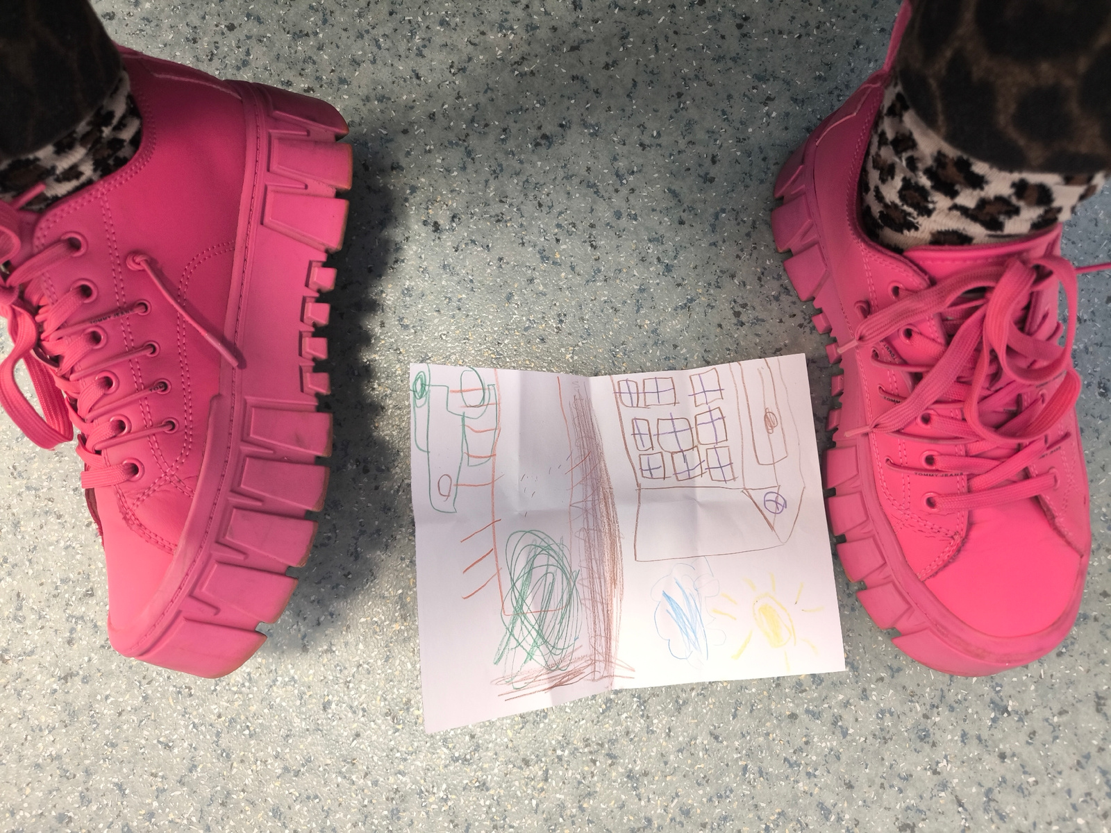 The image is a top-down shot of a pair of bright pink platform sneakers flanking a child's drawing on a mottled gray surface, possibly a tile floor. The sneakers are laced and appear to be new. The pe…read more