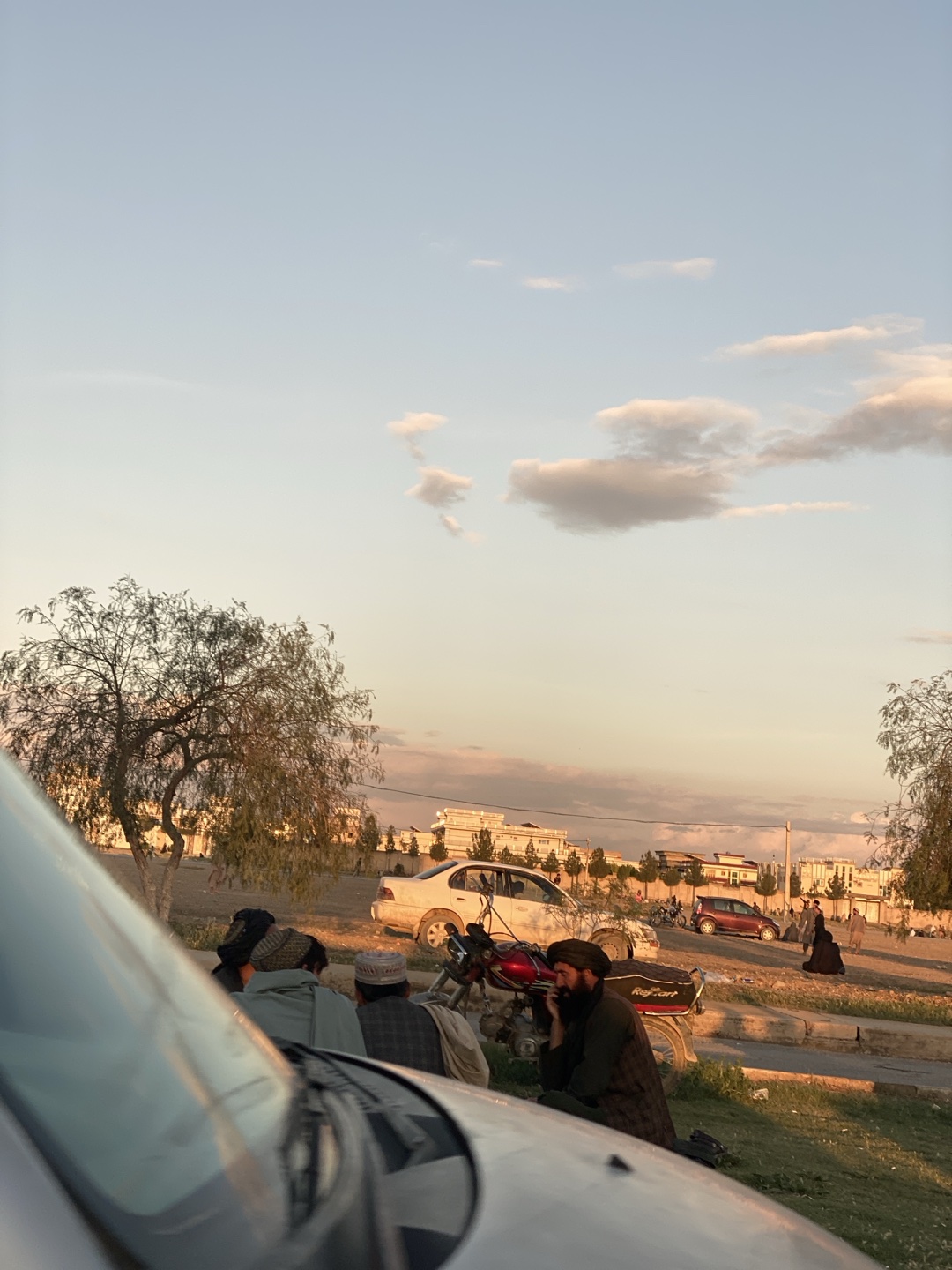 The image shows a group of men sitting on the grass next to a road in what appears to be a city in Afghanistan. A partially visible car is in the foreground, and a motorcycle is parked nearby. Other c…read more