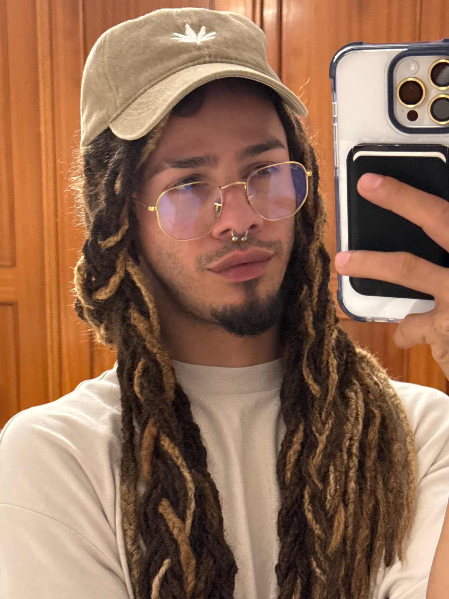 The image shows a selfie of a person with dreadlocks wearing glasses and a cap with a star on it. The person is holding up a phone with a clear case, revealing the multiple camera lenses and a black o…read more