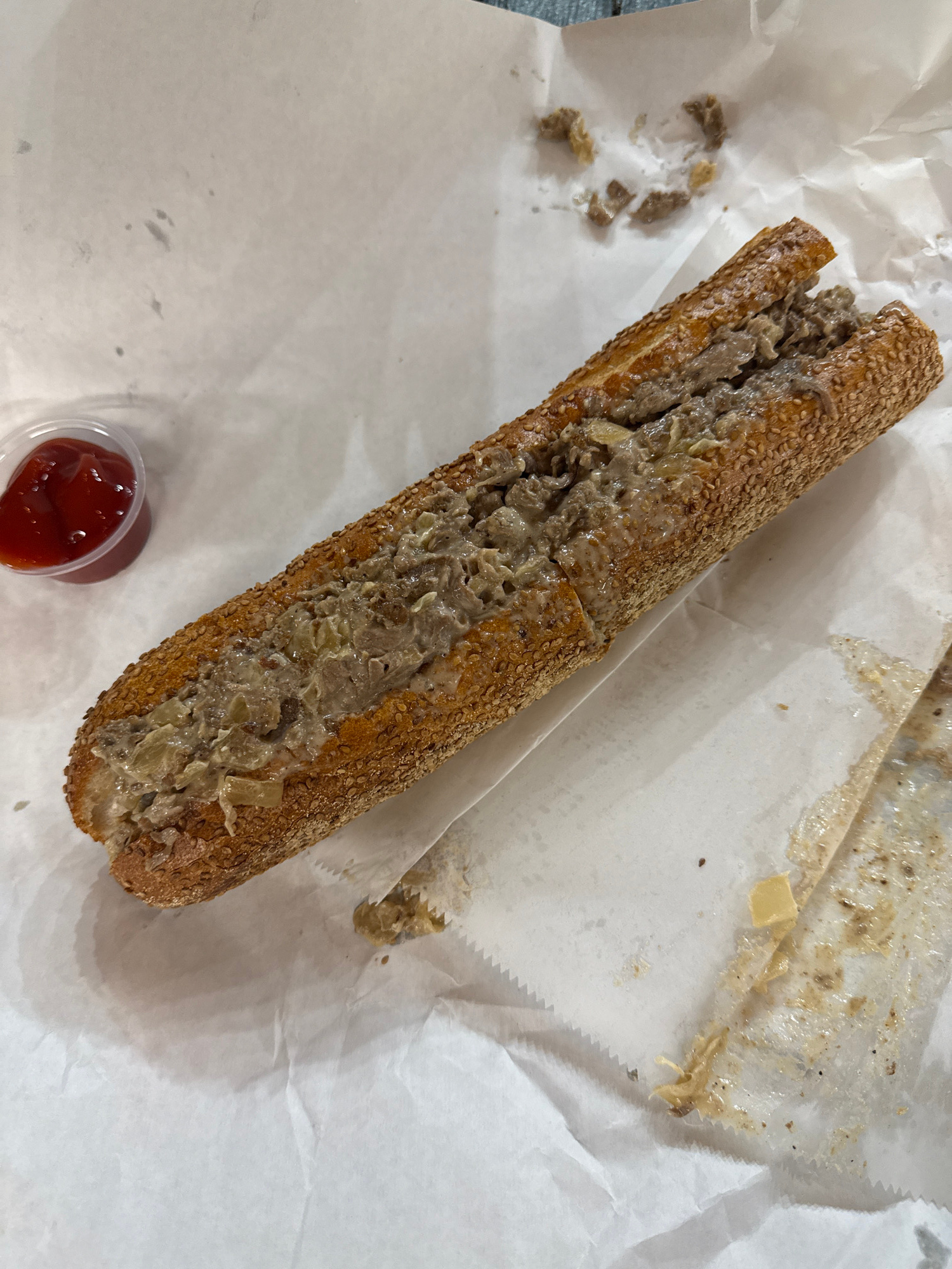 A close-up, high-angle shot depicts a cheesesteak sandwich on a white paper-lined surface, potentially from a restaurant or takeout setting. The sandwich features a sesame seed-covered roll filled wit…read more