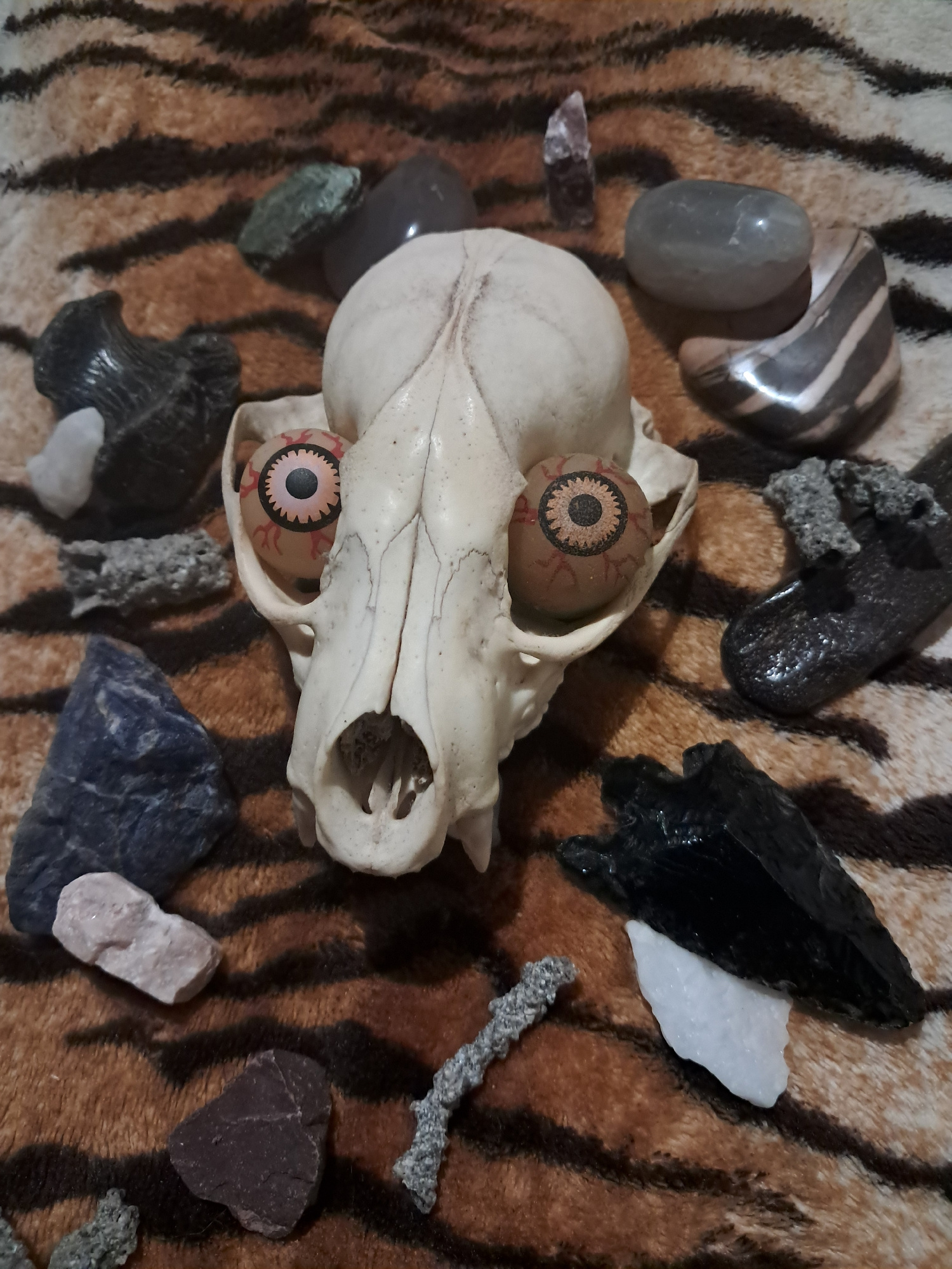 The image depicts a mammalian skull with two decorative eyeballs placed inside the eye sockets. The skull and eyeballs are surrounded by an assortment of rocks and minerals on a patterned fabric resem…read more
