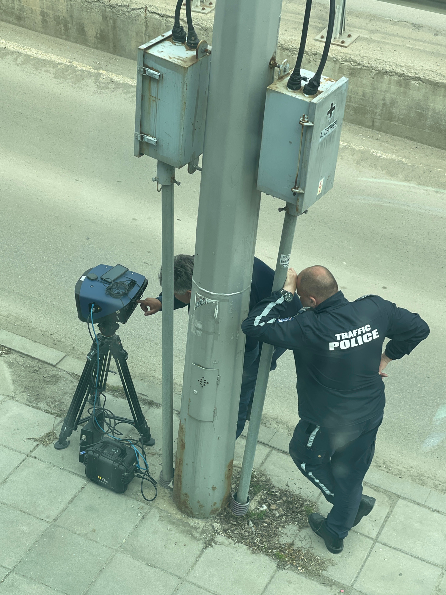 The image, taken in Sofia, Bulgaria, depicts an outdoor urban setting featuring two individuals and specialized equipment. The scene is dominated by a thick, grey pole, possibly a street light or traf…read more