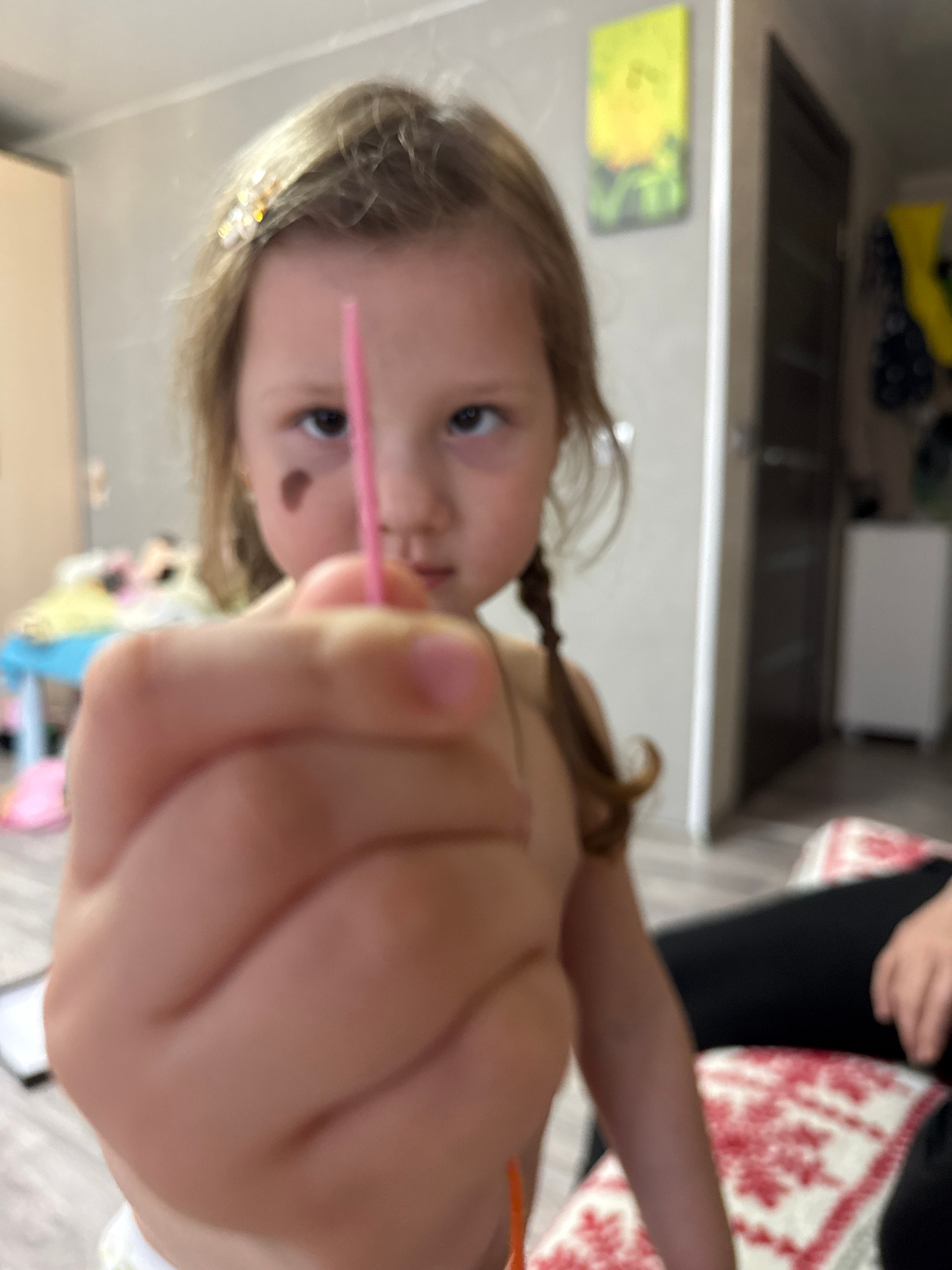 A young girl with light brown hair styled in pigtails is holding a pink stick towards the camera. Her left eye is visible. Her right hand is obscuring a portion of the image. The background includes a…read more