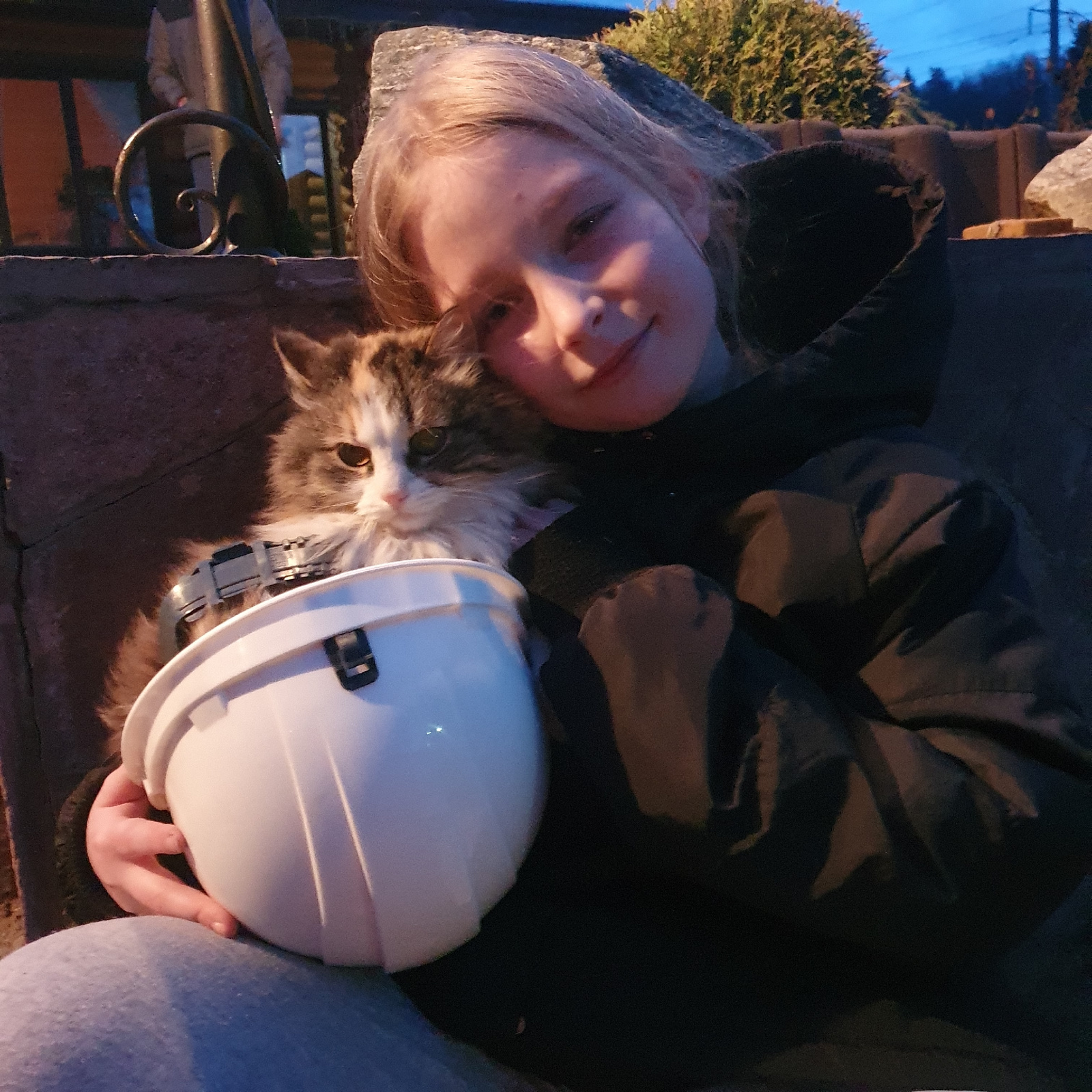 A light-skinned person is lying on their side outside, with a gray and white tabby cat nestled against their chest. The person wears a black jacket. Their blonde hair is near a wrought-iron railing. A…read more