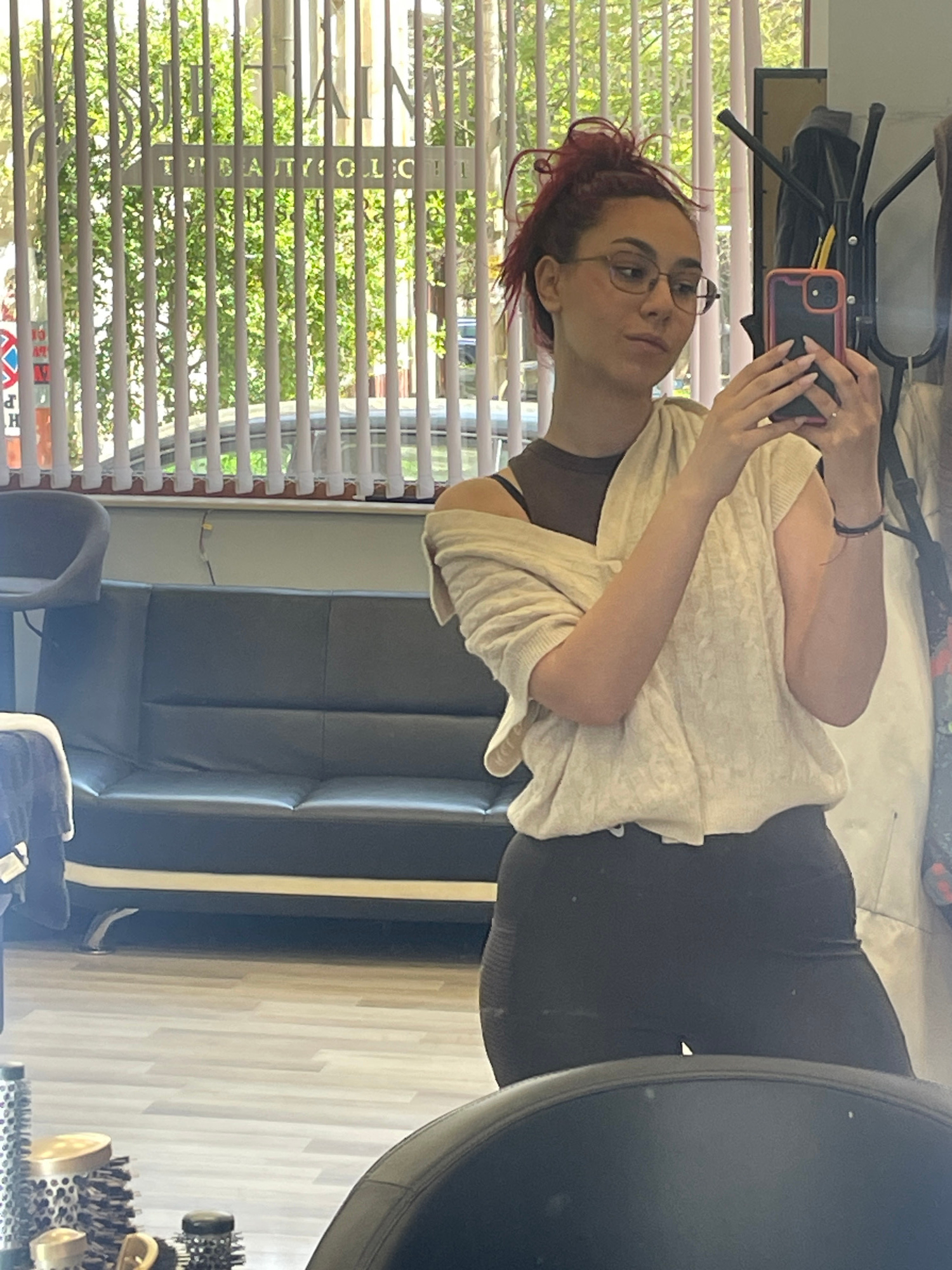 The image is a mirror selfie, originally captured sideways, featuring a young woman in an indoor setting. The woman, positioned on the left, has reddish hair tied up in a messy style and wears round e…read more