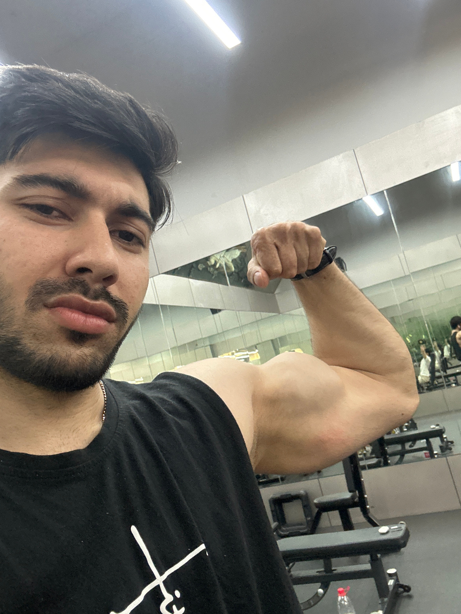 A young man takes a selfie while flexing his left bicep in what appears to be a gym or fitness center located in Chongqing High-tech Zone, China. The image is taken from a slightly upward, close-up an…read more
