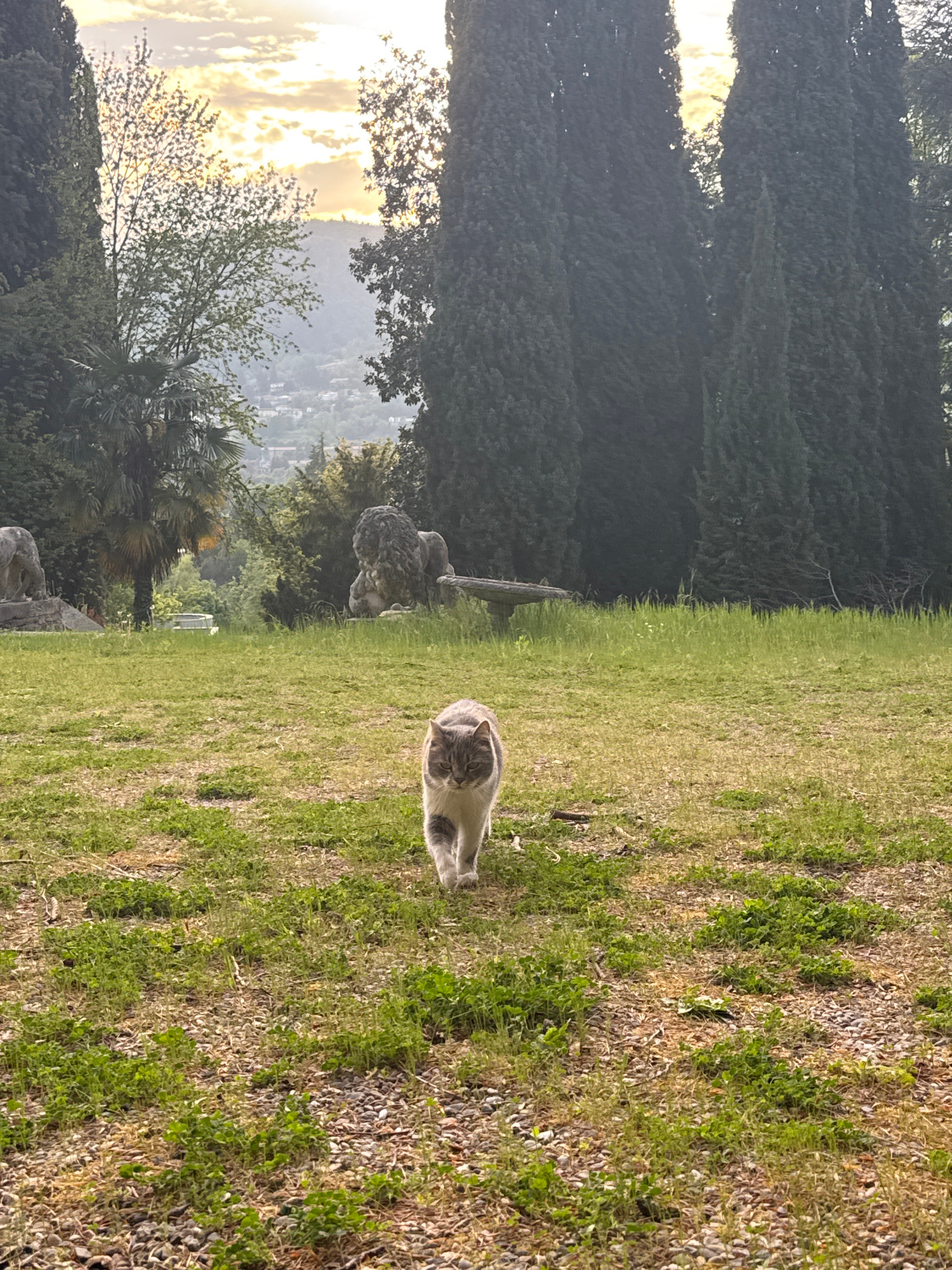 A landscape photograph, oriented vertically, depicts a tranquil scene in Erba, Italy. The foreground is dominated by a patch of green grass, with a light grey and white tabby cat near the center of th…read more