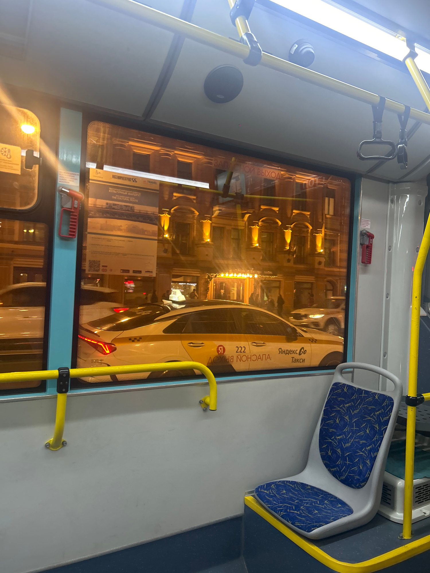 The image captures an interior view of a public transport vehicle, likely a bus or tram, at night in Saint Petersburg, Russia. The perspective looks outwards through a large window, simultaneously ref…read more
