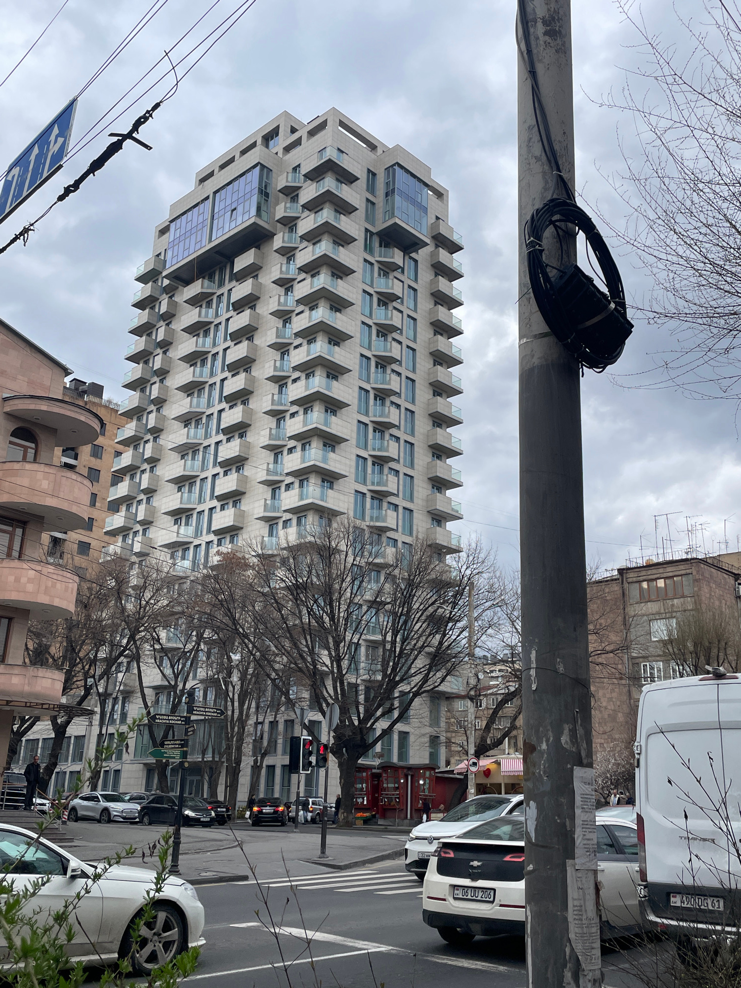 The image captures a street scene in Yerevan, Armenia, featuring a modern, tall building with projecting balconies, situated among older buildings. A utility pole with attached wires and equipment run…read more