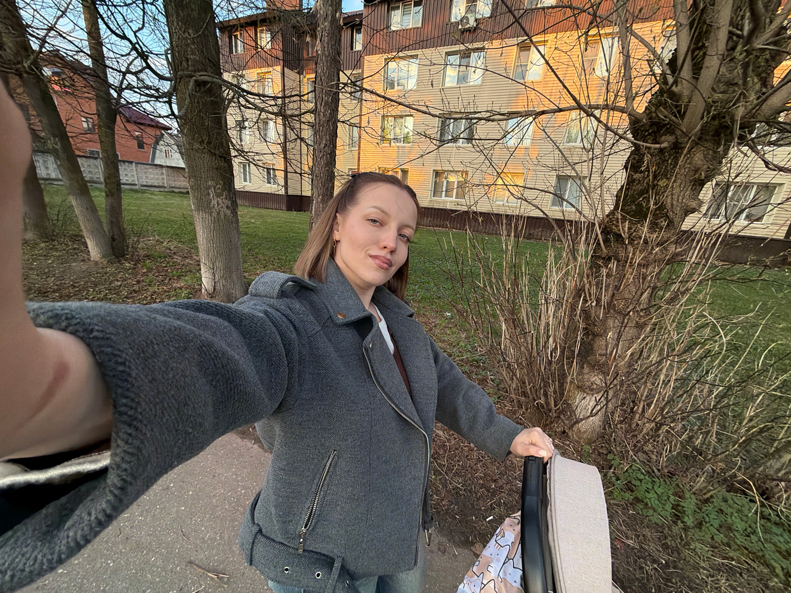 A selfie captures a woman in Reshetnikovo, Russia. She is wearing a gray jacket and holding a baby stroller with a beige interior. The backdrop includes a multi-story building with light-colored sidin…read more