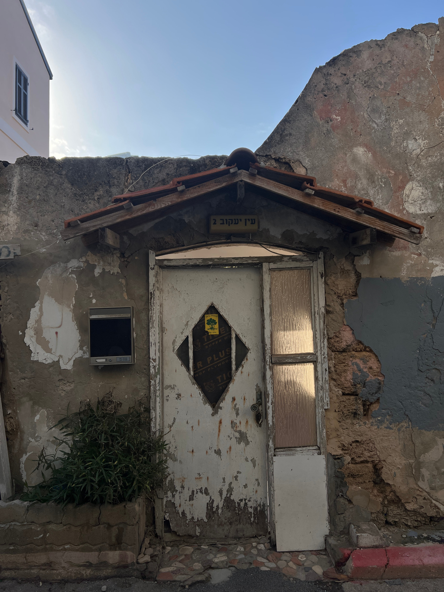 An exterior shot shows a weathered, aged door in Tel Aviv, Israel. The door, painted white and showing significant peeling and wear, features a decorative diamond-shaped insert and a panel of textured…read more