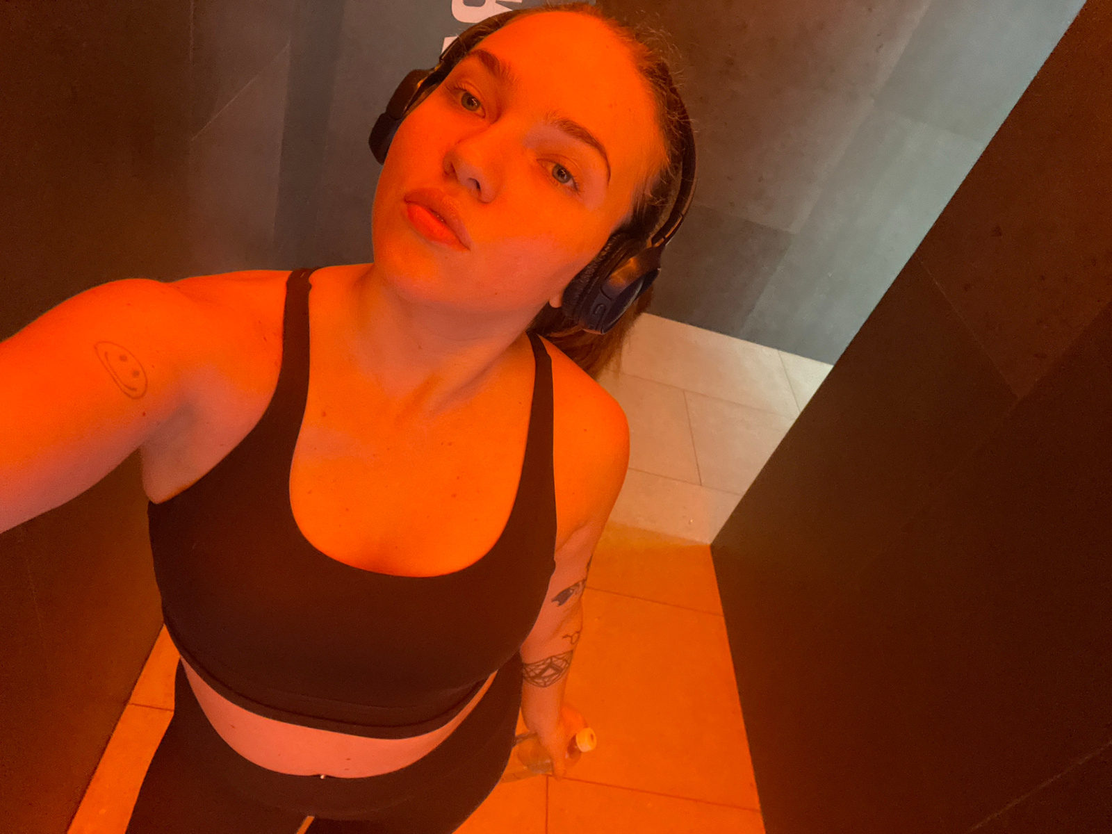 A woman wearing a black sports bra, leggings, and headphones is looking down at the camera. She is holding a water bottle. Tattoos are visible on both arms. The background includes black panels and li…read more