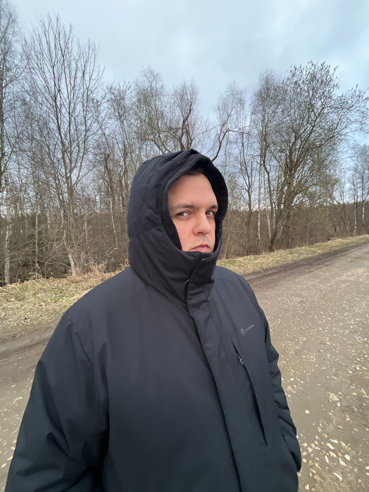 A person in a black hooded jacket is standing on a path in Zolino, Russia. The background includes bare trees and an overcast sky. The path appears to be made of gravel or dirt.