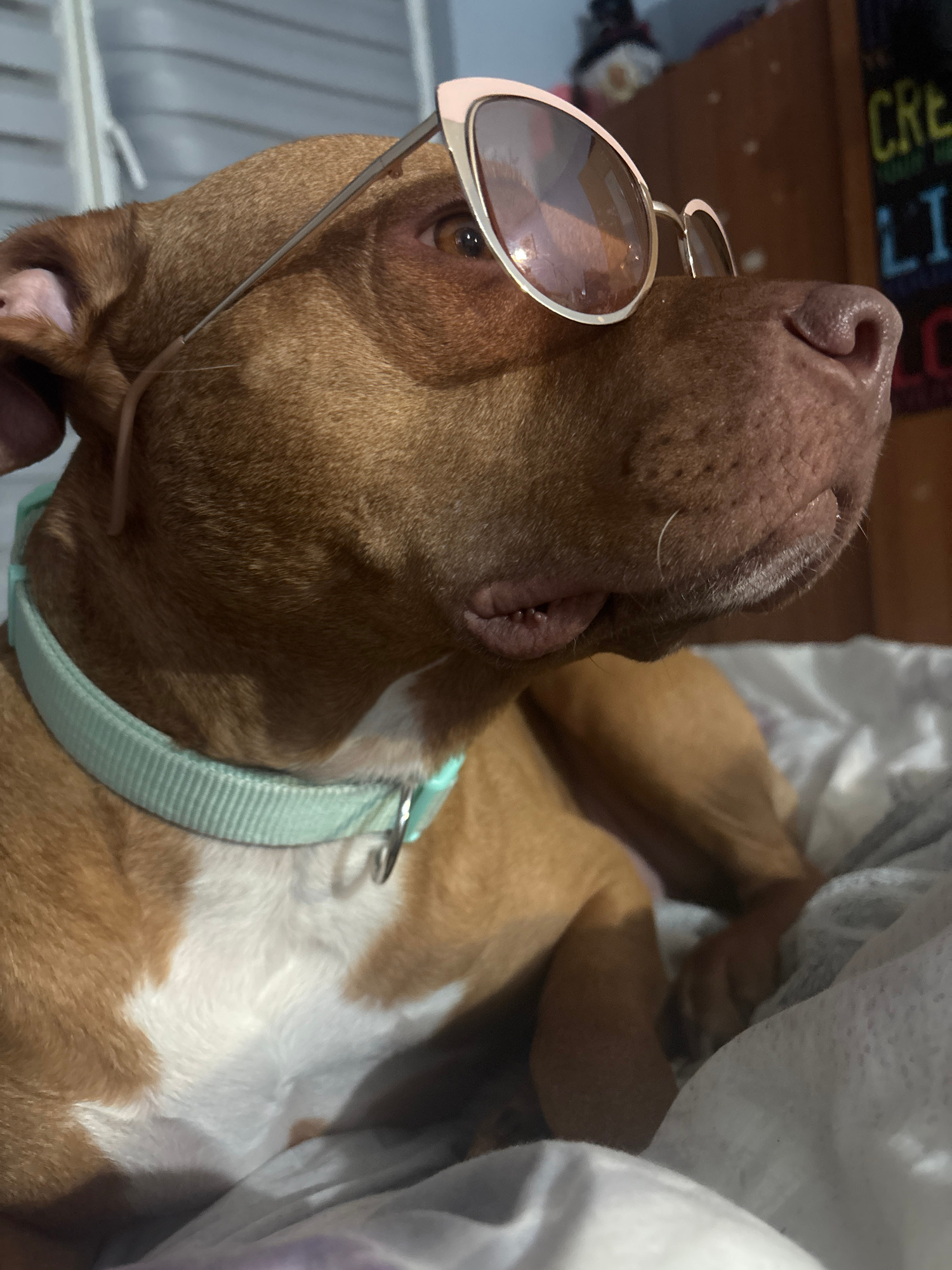 A brown and white dog lies on its back, wearing gold-rimmed sunglasses and a light green collar. The dog's head is tilted back, with its nose pointing upwards. The environment includes white bedding a…read more