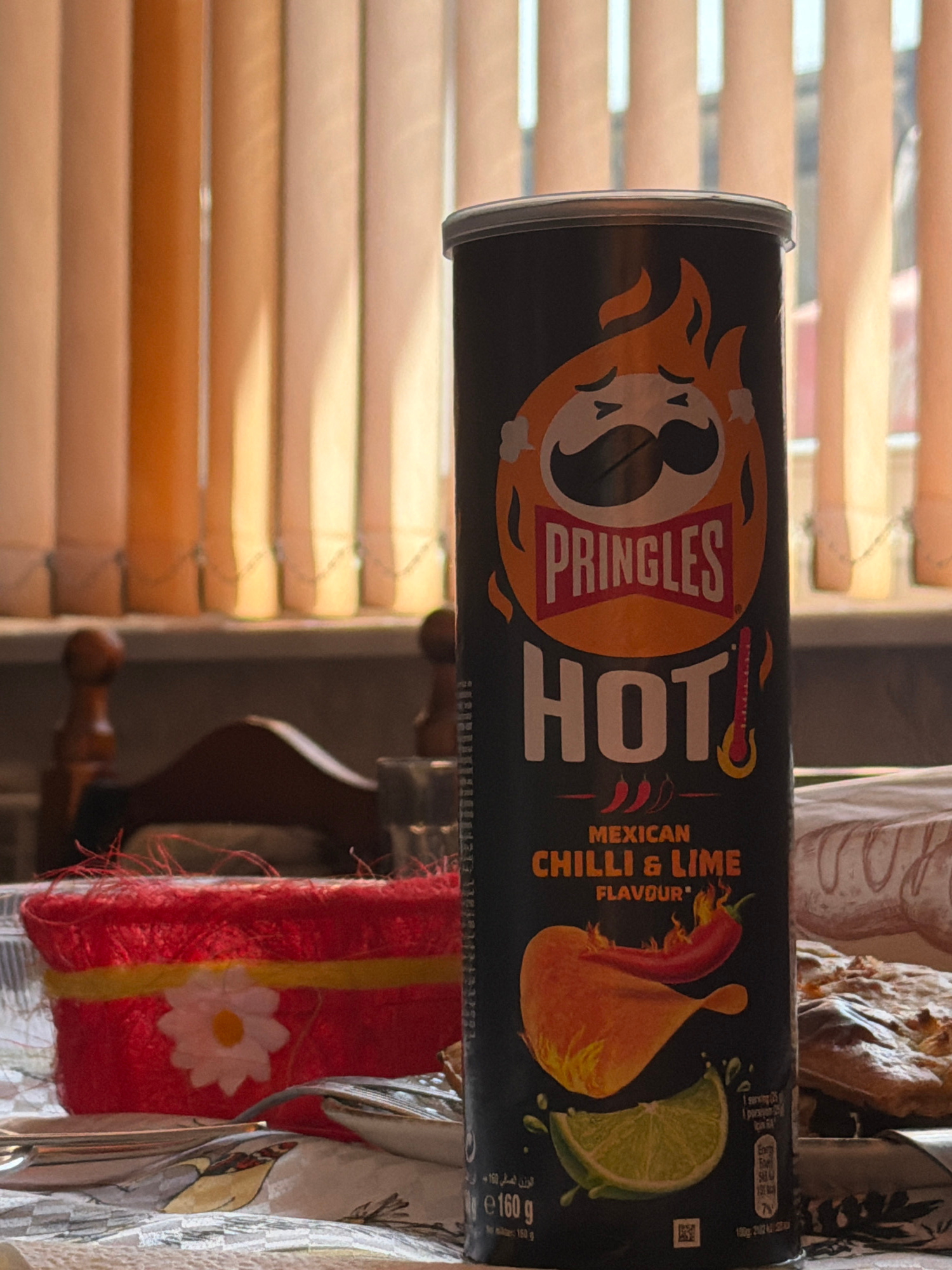 The image shows a can of Pringles "Hot Mexican Chilli & Lime Flavour" leaning against a window with closed blinds. The can is positioned horizontally in the frame, with the branding prominently displa…read more
