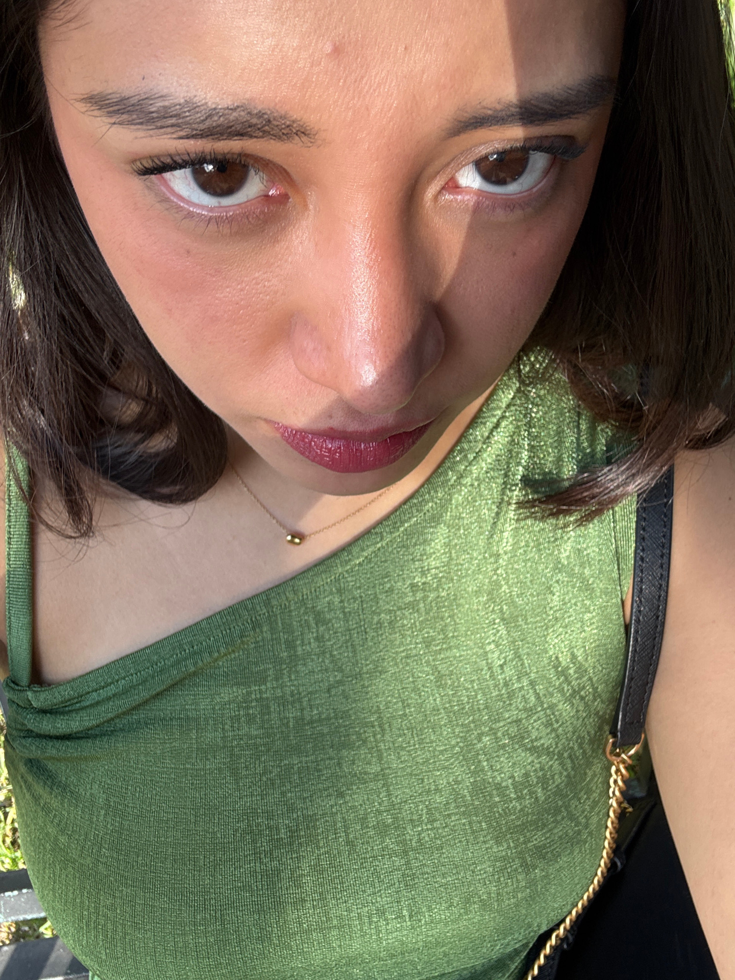 A close-up, tilted portrait of a woman with brown eyes, dark hair, and olive-toned skin. She wears a green, shimmery top and a delicate gold necklace. Part of a black purse strap with gold chain detai…read more