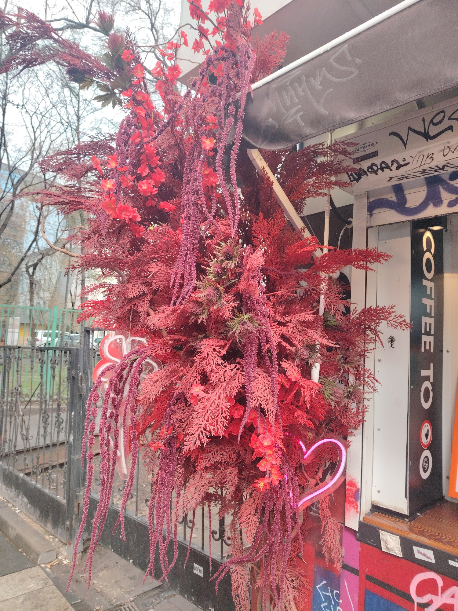 The image captures a vibrant and slightly surreal street scene, likely in a European city. A dense arrangement of red foliage, including cascading amaranthus caudatus, obscures part of a building faca…read more