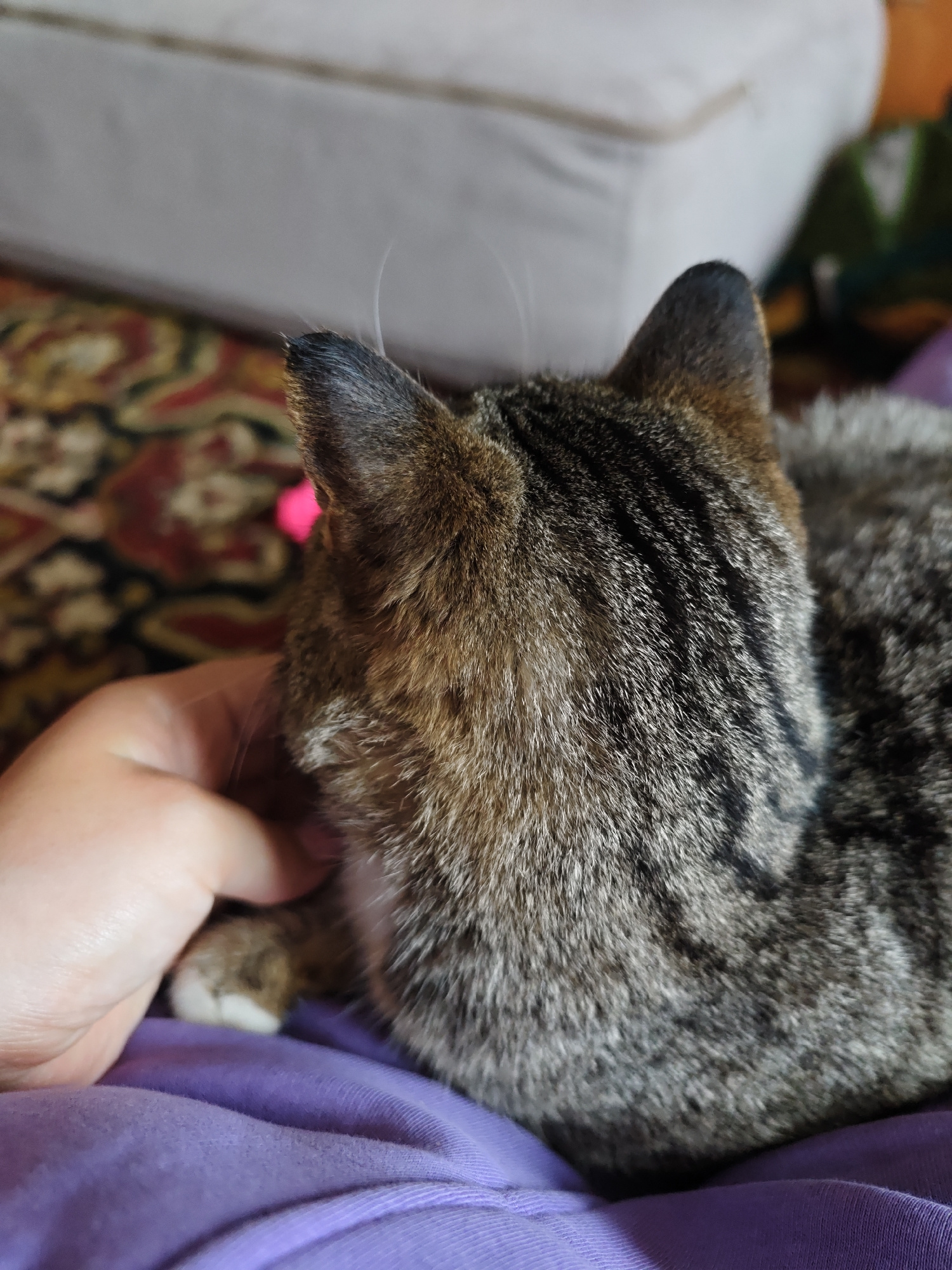 A close-up shot shows the back of a tabby cat lying on a person's lap. The person's hand is gently touching the cat. The cat's fur is gray and black striped. The person is wearing a purple shirt. The…read more