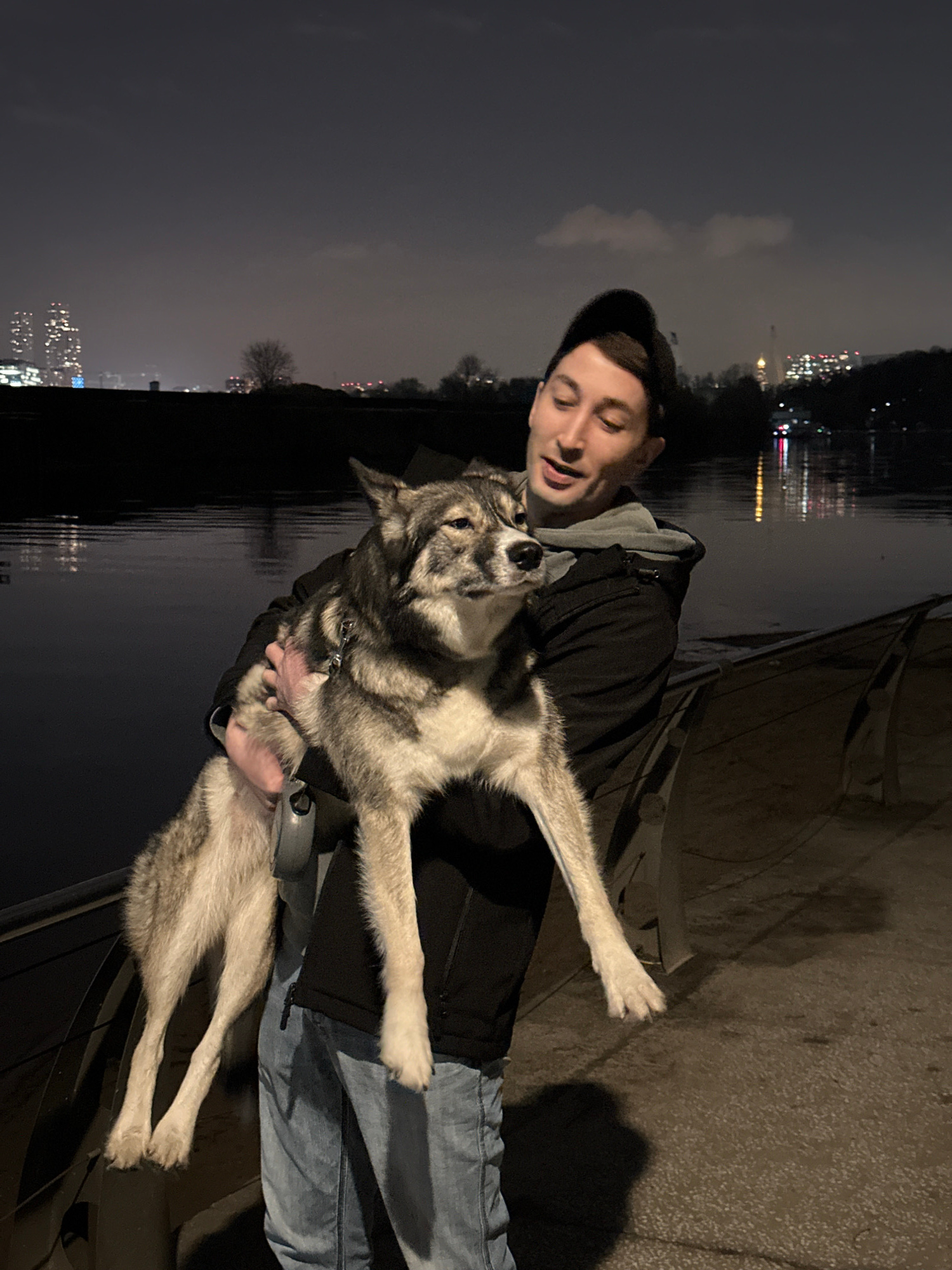 A man holds a large, wolf-like dog in an affectionate embrace at night by a body of water in Moscow, Russia. The man, with short dark hair and wearing a dark cap, a black hooded jacket, and blue jeans…read more