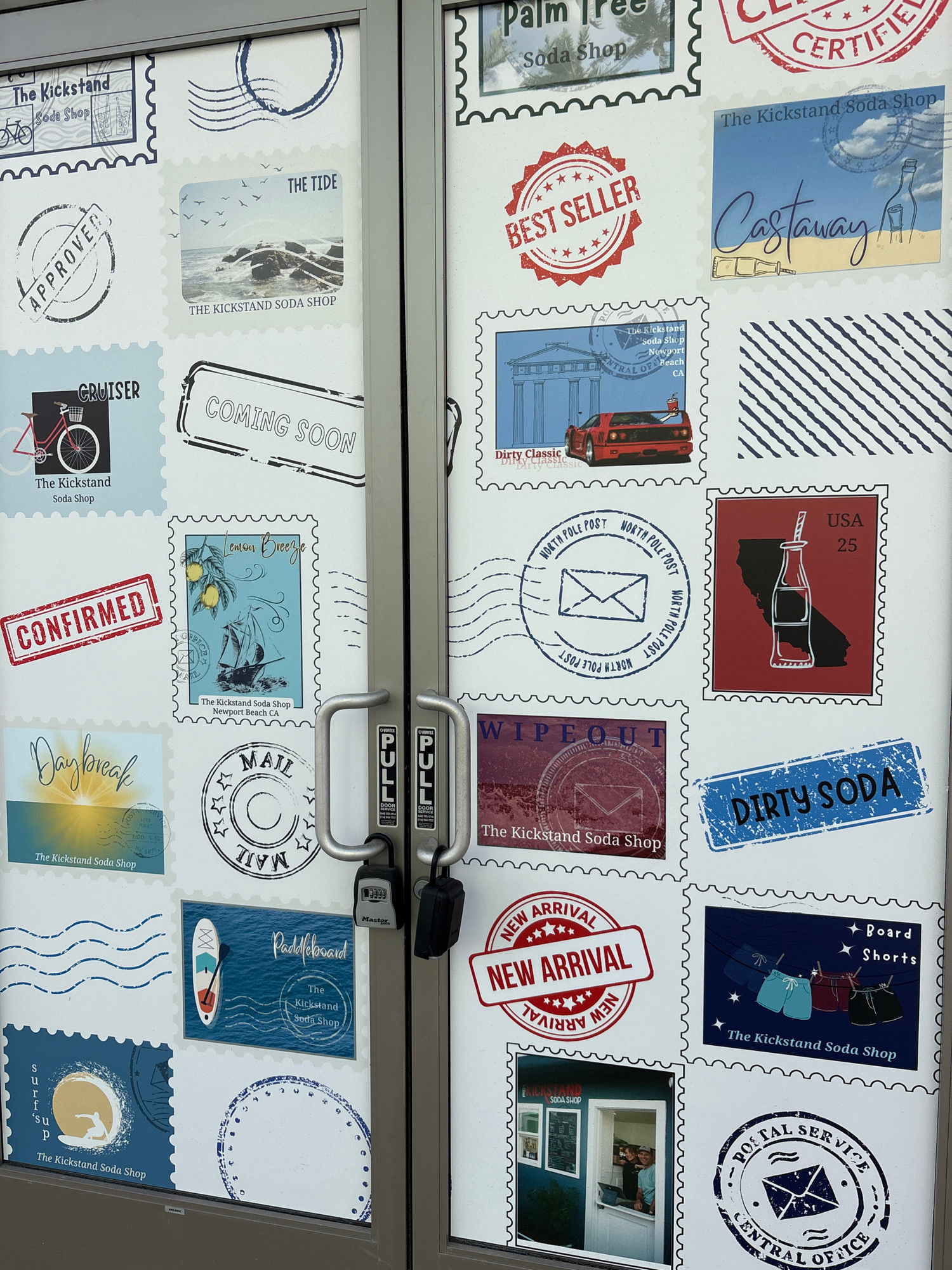 The image captures a glass door, likely of a business in Huntington Beach, USA, adorned with a collage of graphics designed to resemble postage stamps. The door is bisected horizontally by a metal fra…read more
