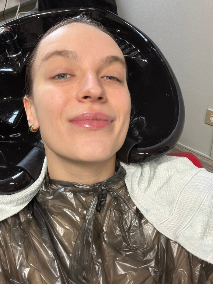 An adult female is depicted in a close-up, high-angle selfie within a hair salon, located in the city of Khimki, Russia. She is positioned reclining backward with her head resting in a black, glossy c…read more
