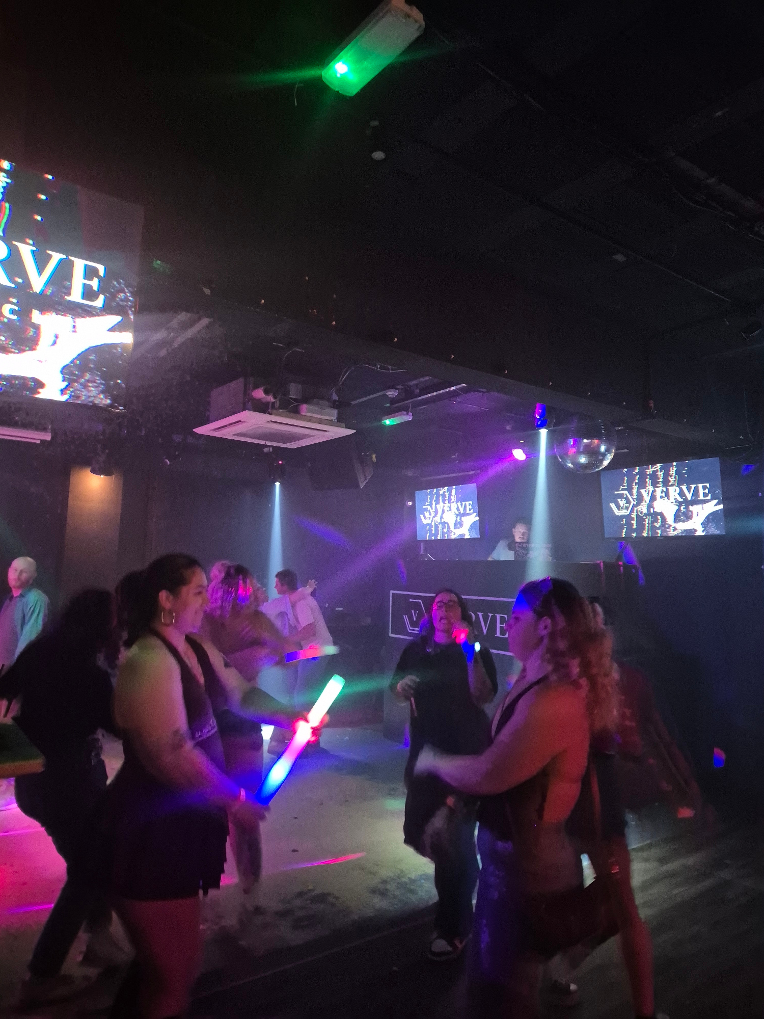 The image captures a dimly lit interior, likely a nightclub, in West Suffolk, United Kingdom. There are multiple screens displaying the word "VERVE". People are dancing, and some are holding glow stic…read more