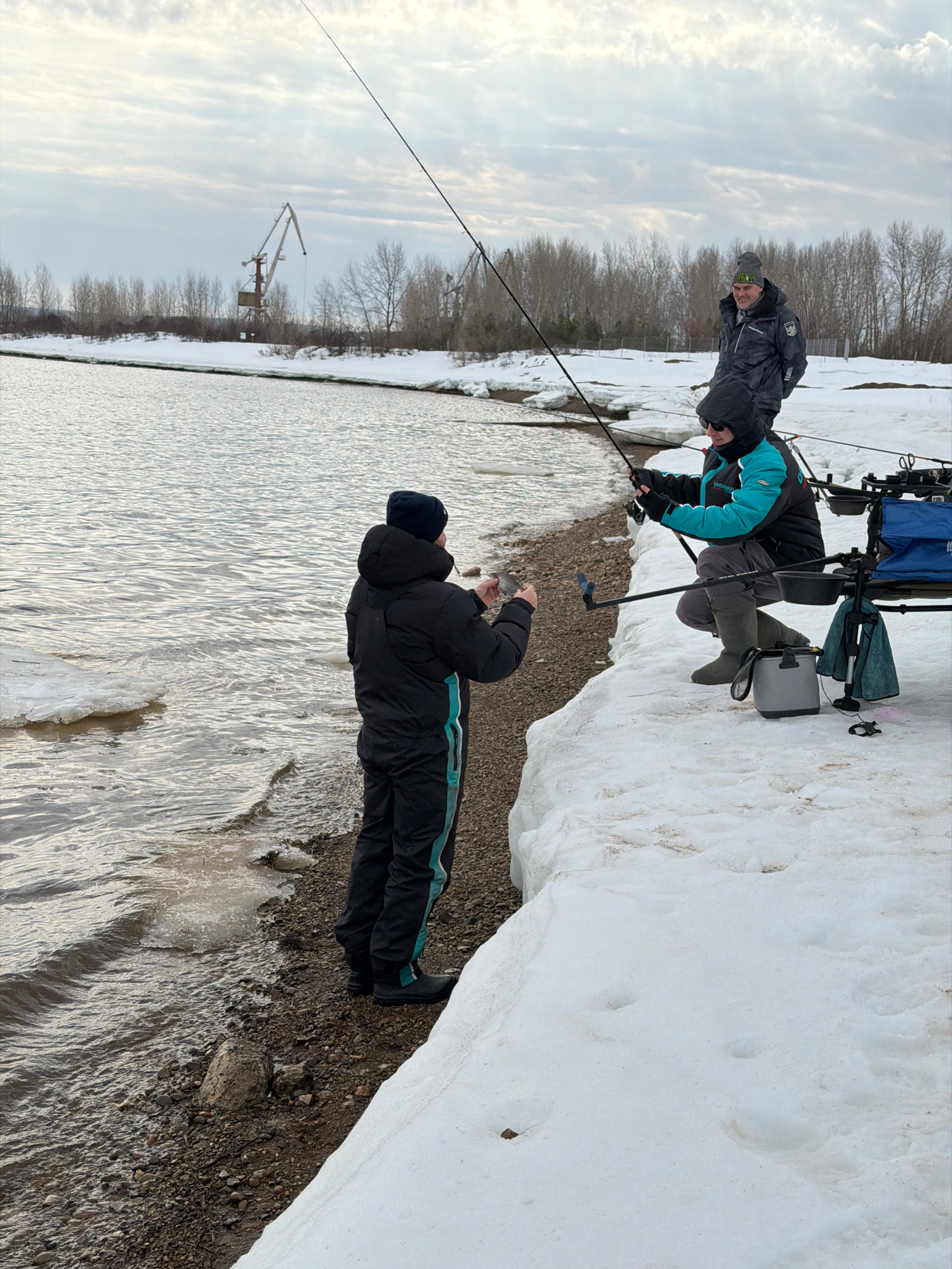 The image depicts two individuals ice fishing in Noviy Urengoy, Russia, amidst a winter scene. One person, clad in a black jacket with a teal stripe, lies prone on the snow-covered bank, holding what…read more