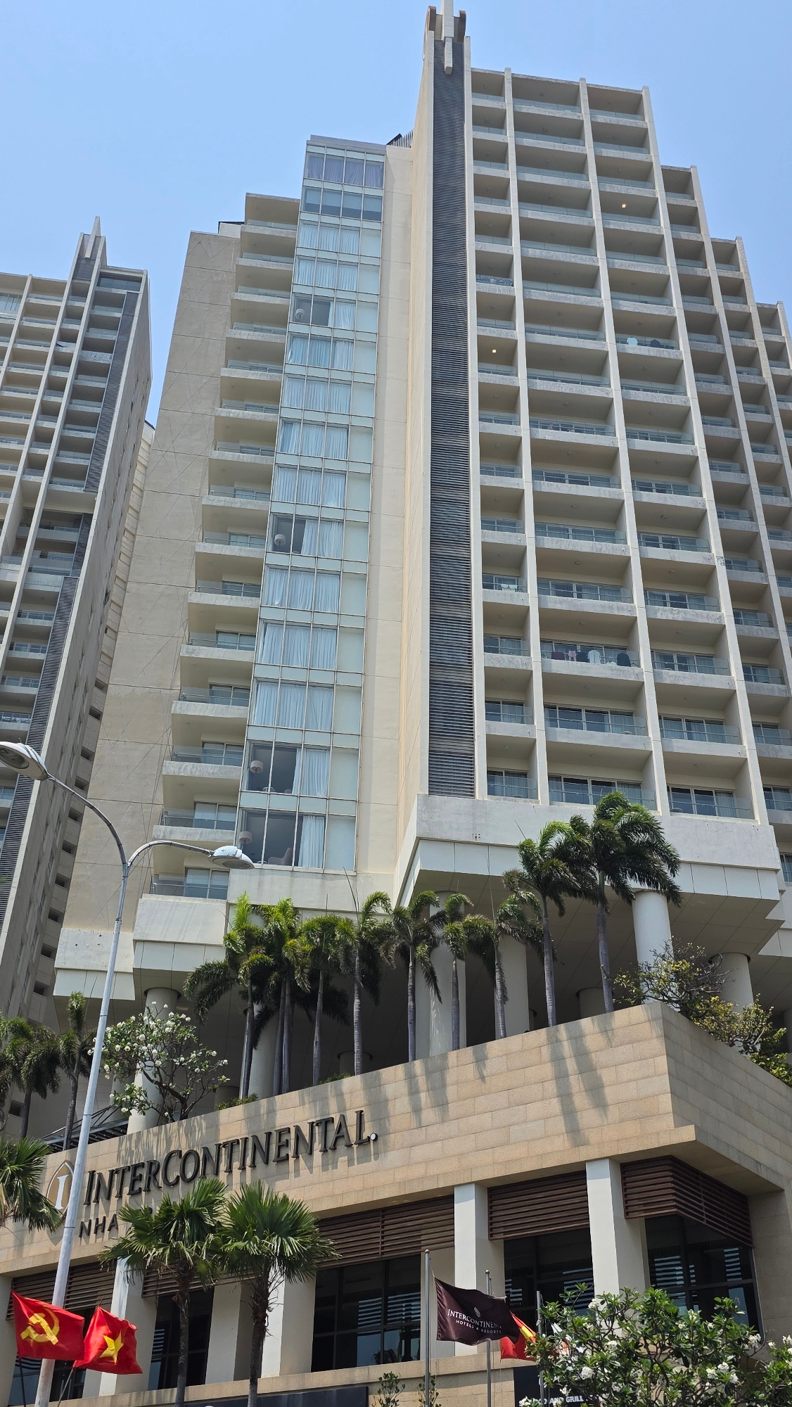 The image shows the InterContinental Nha Trang hotel in Nha Trang, Vietnam. The hotel is a high-rise building with multiple floors and many balconies. The building is a light tan color, and the balcon…read more