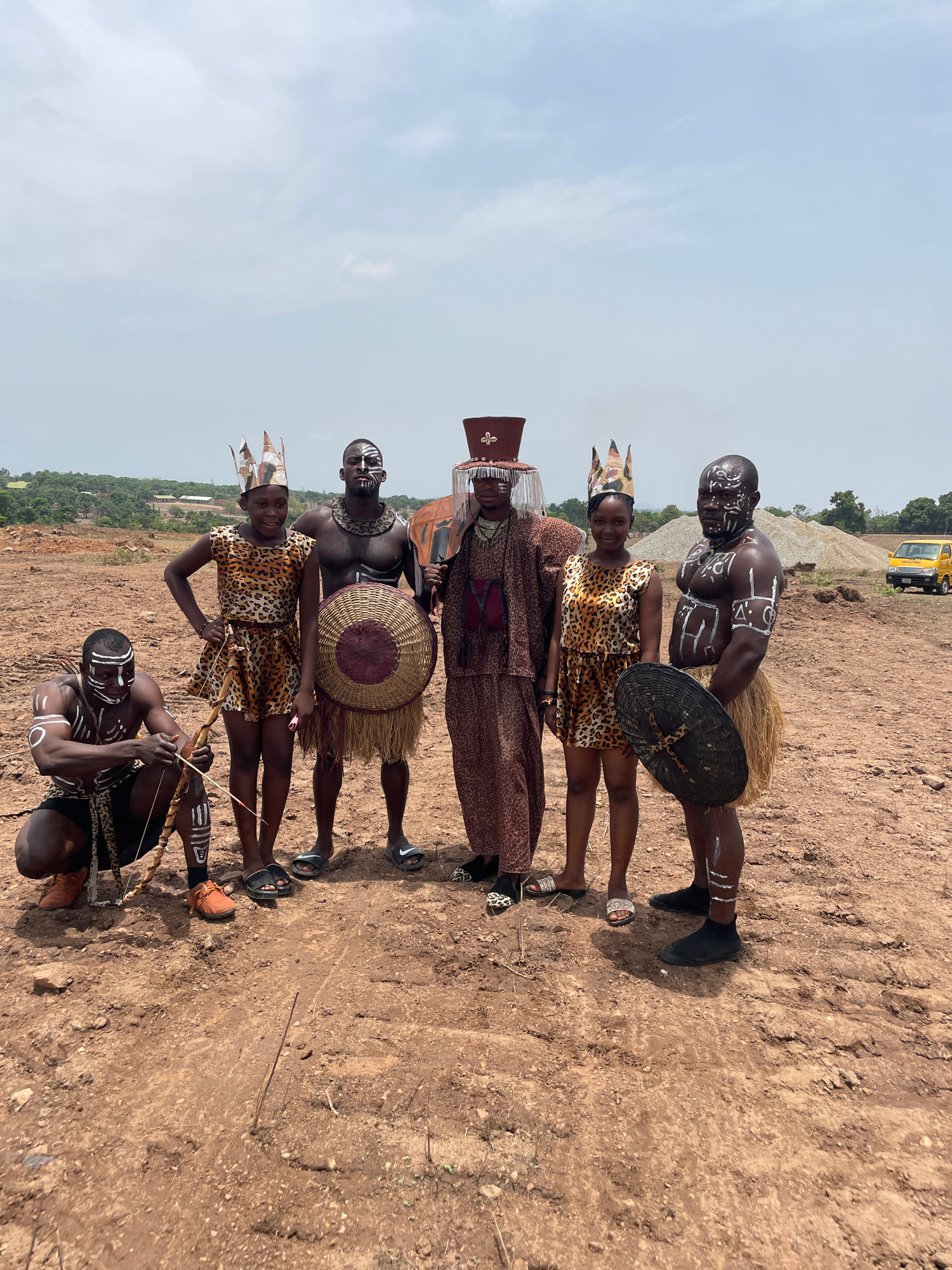 A photo taken in Akwanga, Nigeria, shows six individuals in traditional attire posing outdoors. The ground appears to be dirt and earth. A man at the top of the frame and another at the bottom are kn…read more