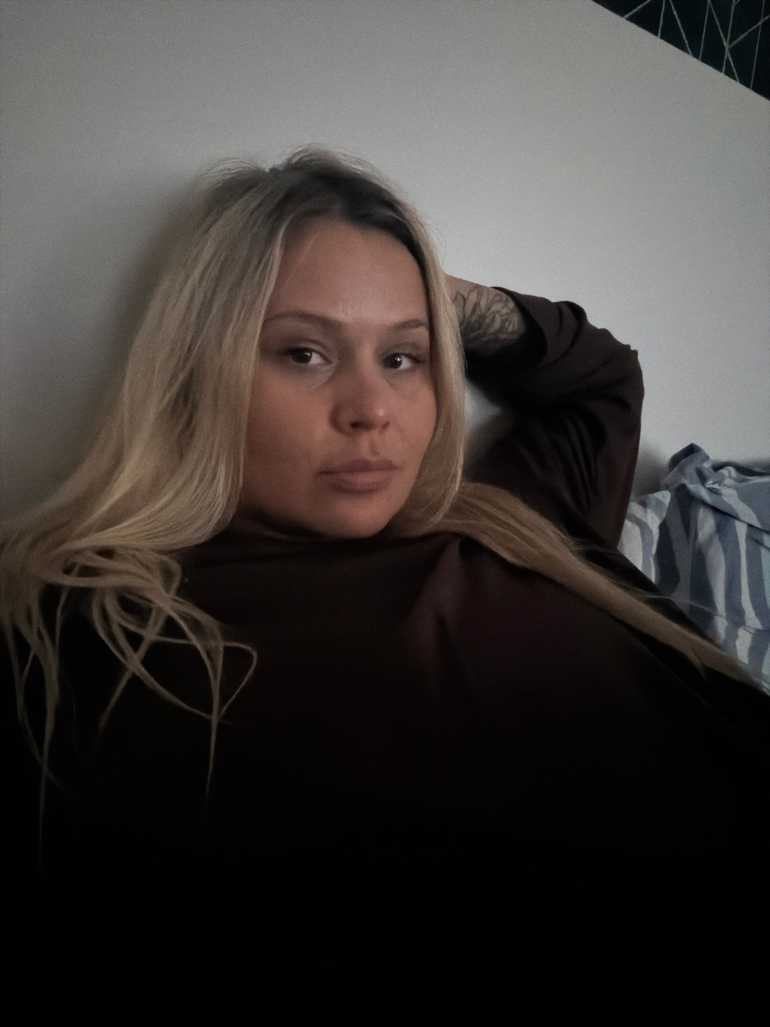 A woman with long, blonde hair lies on a white surface. She is wearing a dark brown top. Her left arm, visible, has a tattoo. A striped fabric is visible in the background. The location is unknown andβ¦read more