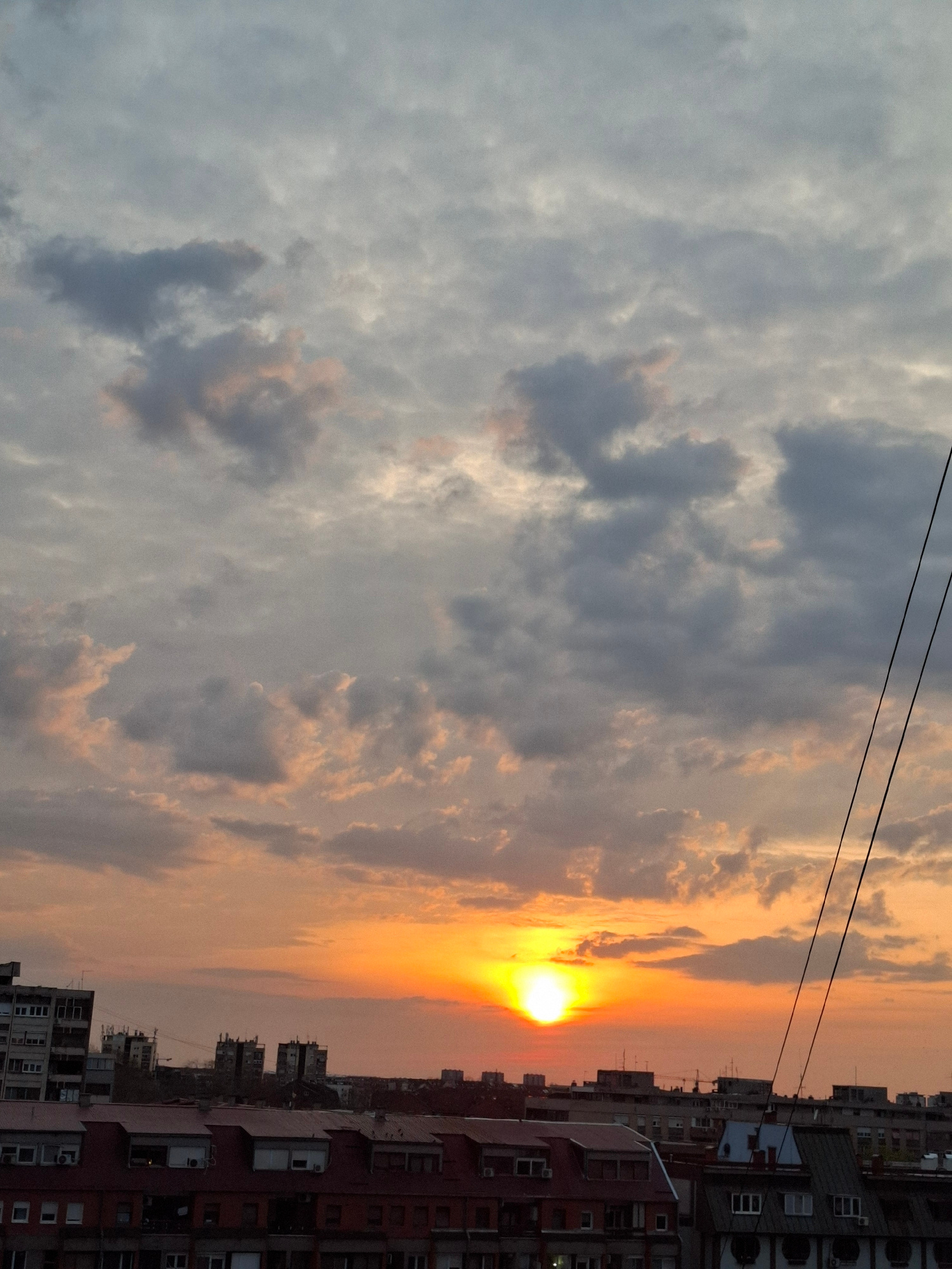 The image shows a sunset in Novi Sad, Serbia, with the sun setting over a cityscape. The sky is filled with clouds, with a mix of gray and orange hues caused by the setting sun. The sun is the focal p…read more