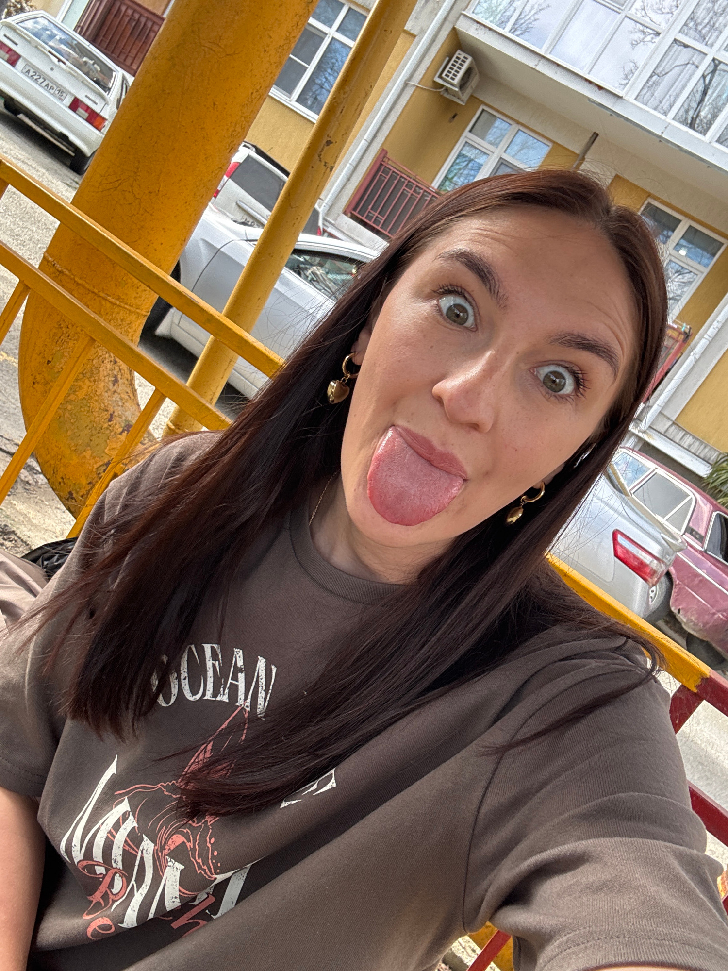 A woman with long, dark hair is taking a selfie outdoors. She is sticking her tongue out and has a playful expression with wide eyes. She is wearing a brown t-shirt with a graphic design. The backgrou…read more