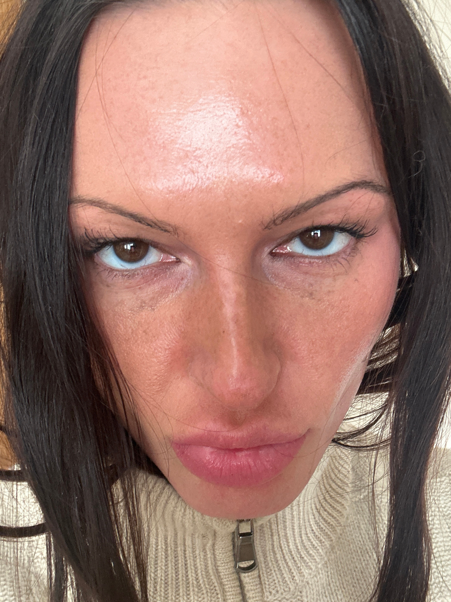A close-up, angled portrait captures a woman with dark brown hair partially framing her face. Her skin has a dewy appearance. She has brown eyes with visible mascara on her eyelashes. Her lips are a s…read more